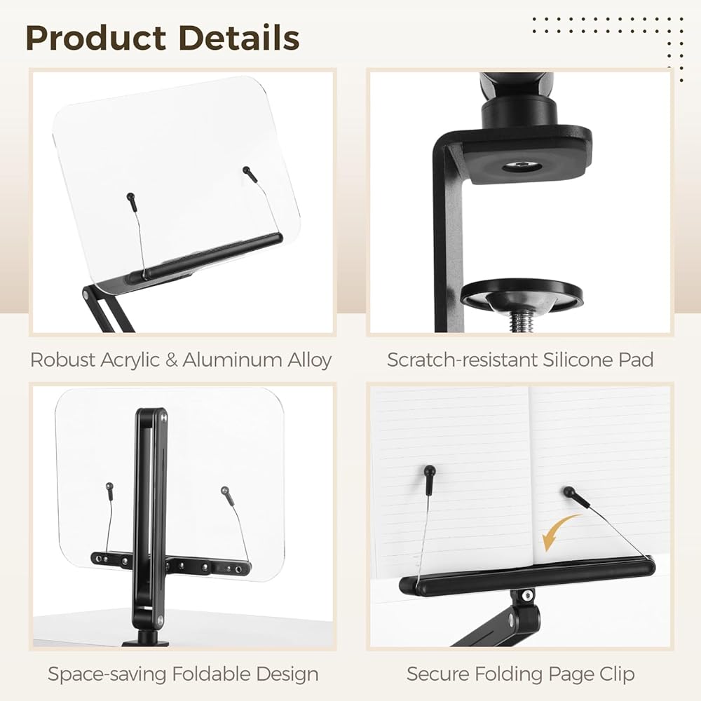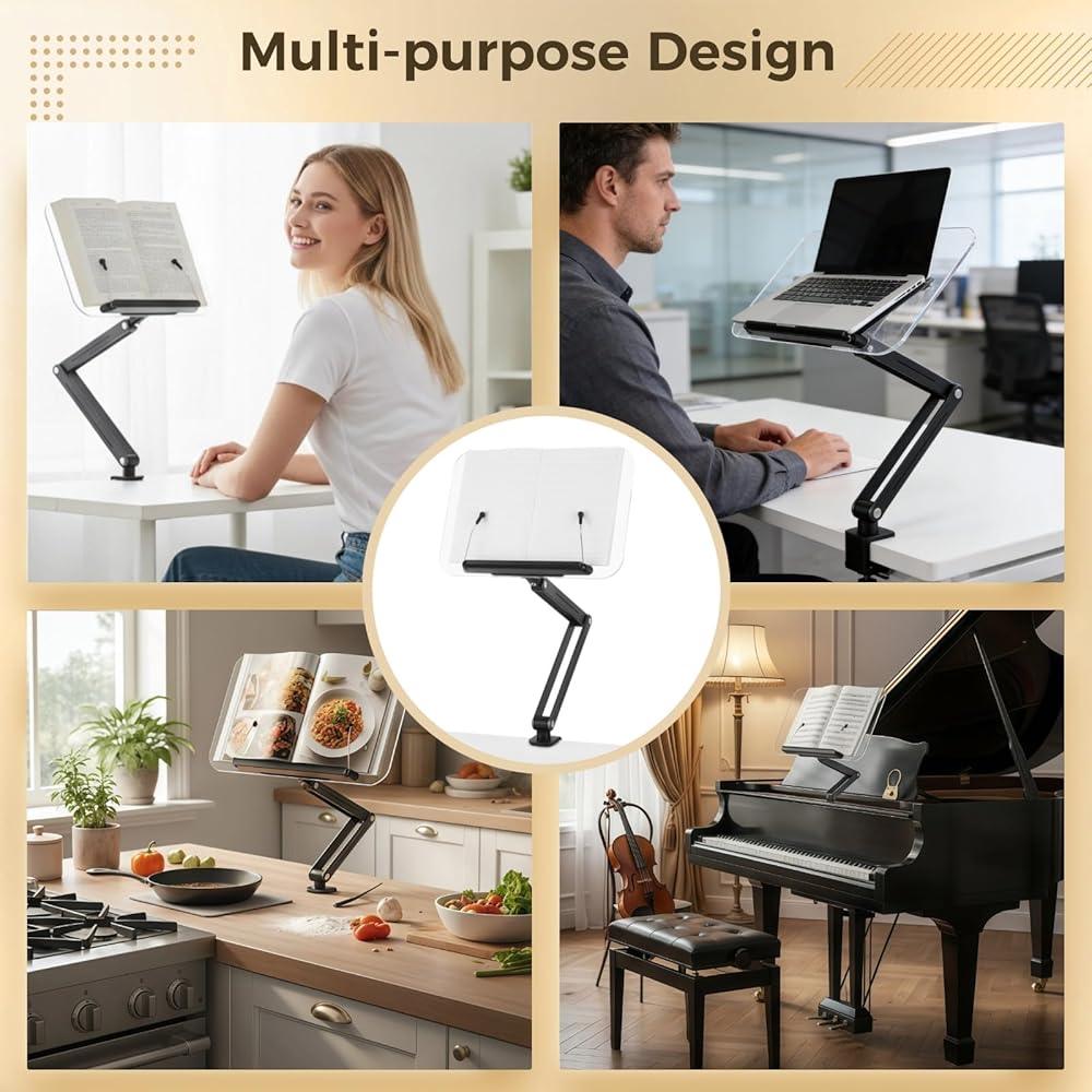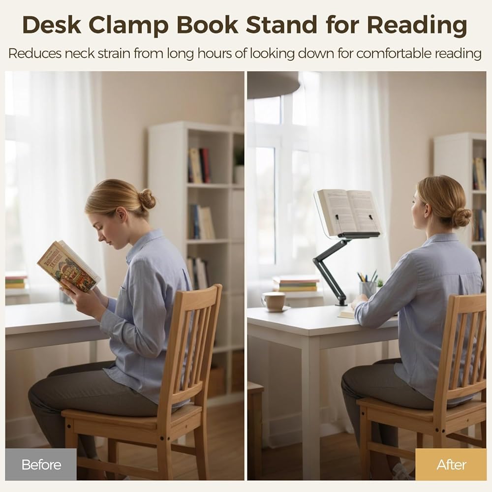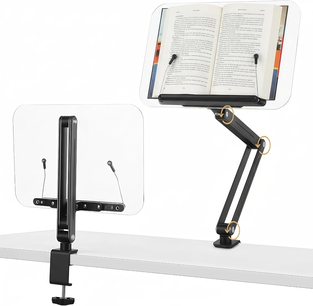 حامل كتب بمشبك مكتب مع ذراع قابل للتعديل، حامل كتب مريح لسطح المكتب للقراءة، حامل كتب الطبخ قابل للطي مع مشبك للمكتب، حامل قراءة الكتب بدون استخدام اليدين