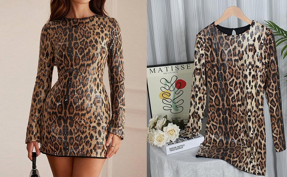 المزايا: فستان نسائي لامع مصنوع من نسيج مرن، مما يسمح بملاءمة مريحة. فستان الحفلات هذا مزين بالترتر، ويتميز بطباعة جلد الفهد، ورقبة دائرية، وأكمام طويلة، وشكل مناسب، وتصميم سهل الارتداء، وقصة ضيقة، وطول الركبة، فستاننا اللامع يحتضن جسمك في جميع الأماكن الصحيحة، ويتبع الانحناءات الطبيعية للجسم لخلق صورة ظلية جذابة.