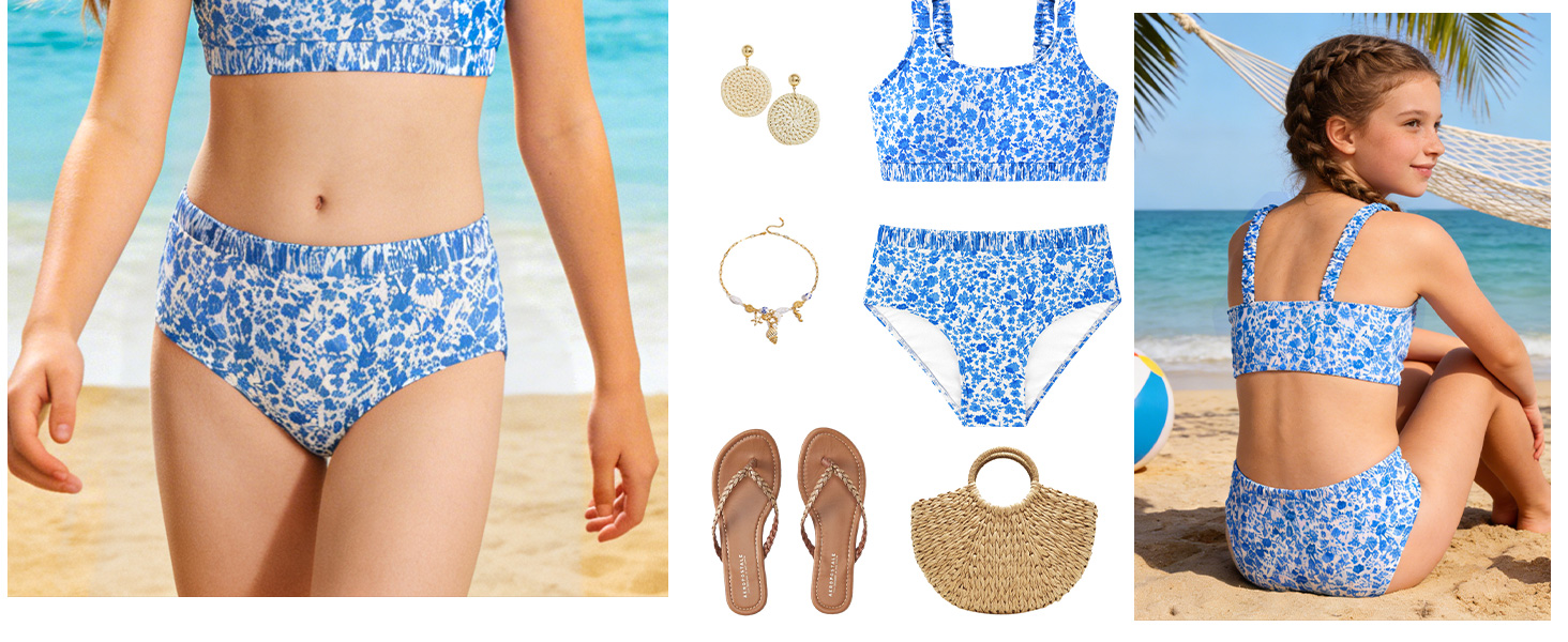 تصميم الموضة: ملابس سباحة للفتيات بطباعة زهور. يتميز الجزء العلوي من البيكيني ببطانة قابلة للإزالة، وخط رقبة واسع، وأشرطة رفيعة قابلة للتعديل لسهولة الارتداء والخلع. تتيح ملابس السباحة للفتيات هذه لأطفالك الاستمتاع بالسباحة بشكل مستقل