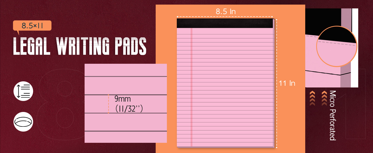 【الكمية والحجم】كل عبوة مكونة من 8.5 × 11 وسادة قانونية وردية تأتي مع 3 قطع من الوسائد الورقية البيضاء. توفر وسادات الكتابة العريضة (11/32 بوصة) مقاس 9 مم مقاس 8.5 × 11 مساحة كبيرة لملاحظاتك، كما أن المسافات تجعل من السهل كتابة المزيد من الملاحظات على كل ورقة. يحتوي كل دفتر وردي مسطر مقاس 8.5 × 11 على 30 ورقة من 60 صفحة، بإجمالي 180 صفحة. تمنحك دفاتر الملاحظات الوردية مقاس 8.5 × 11 مساحة كبيرة لتسجيل أفكارك وأفكارك.