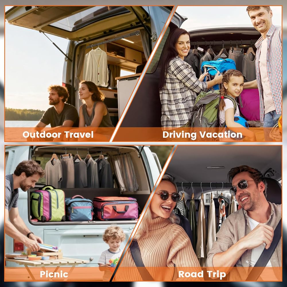 سهولة التركيب: إن شريط شماعات ملابس السيارة الخاص بنا سهل التركيب للغاية - ما عليك سوى شد الأنابيب الفولاذية في ثلاث خطوات للحصول على شماعة معطف سيارة ثابتة وقوية. يمكنها تعليق ما يقرب من 50 إلى 60 قطعة من الملابس.
