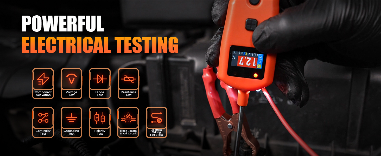 2. 【اختبار دائرة السيارات متعدد الاستخدامات】 تدعم الأوضاع الثلاثة لاختبار الدائرة وظائف متعددة، بما في ذلك تفعيل المكونات، واختبارات الجهد، واختبارات الصمام الثنائي، واختبارات المقاومة، واختبارات الاستمرارية، واختبارات التأريض، واختبارات القطبية، وتتبع موقع الدائرة القصيرة، واختبارات أخطاء الأسلاك الكهربائية، وما إلى ذلك. سهل التشغيل وعالي الكفاءة، يمكن لجهاز اختبار المسبار هذا أن يحل محل مصابيح الاختبار، أجهزة القياس المتعددة، وأسلاك التوصيل، واختبارات الصمامات، مما يجعلها أداة يجب أن يمتلكها كل مالك مركبة أو فني محترف.