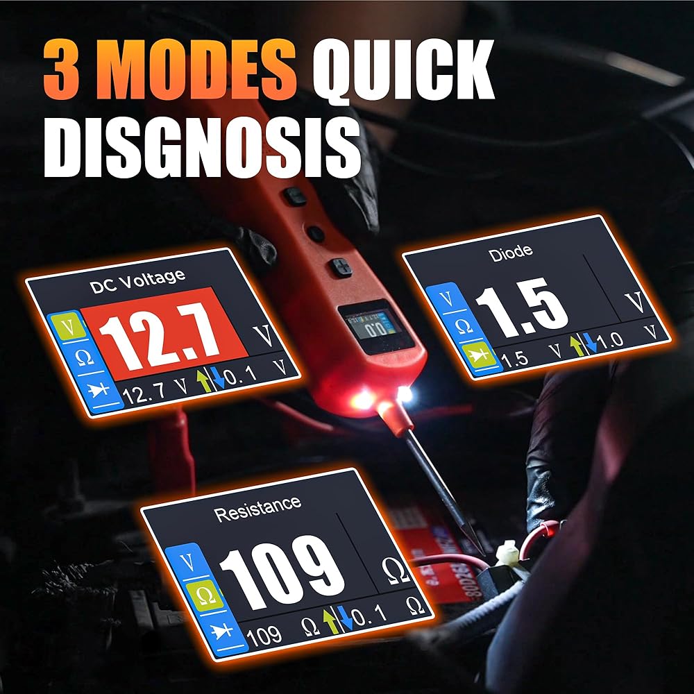 1. 【الوضع الثلاثي الاحترافي】 يقوم جهاز اختبار دائرة السيارات الخاص بنا بالتبديل بسلاسة بين أوضاع Ⓜ️الجهد والمقاومة وⓂ️الصمام الثنائي مع التشغيل بلمسة واحدة. يتميز بأكثر من 10 وظائف اختبار وشاشة رقمية ملونة، فهو يوفر تشخيصات فعالة ودقيقة وبديهية للأنظمة الكهربائية للمركبات. إنه الخيار المثالي للجراجات والممرات وعشاق الأعمال اليدوية.