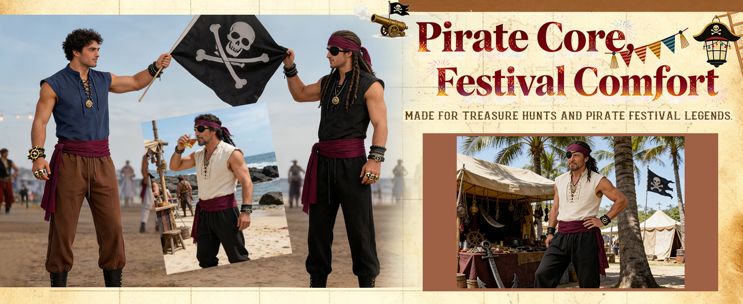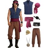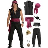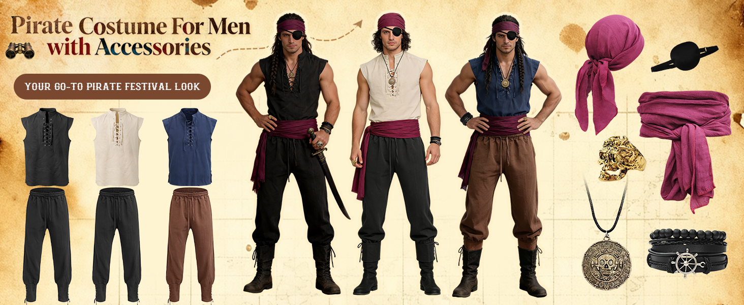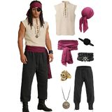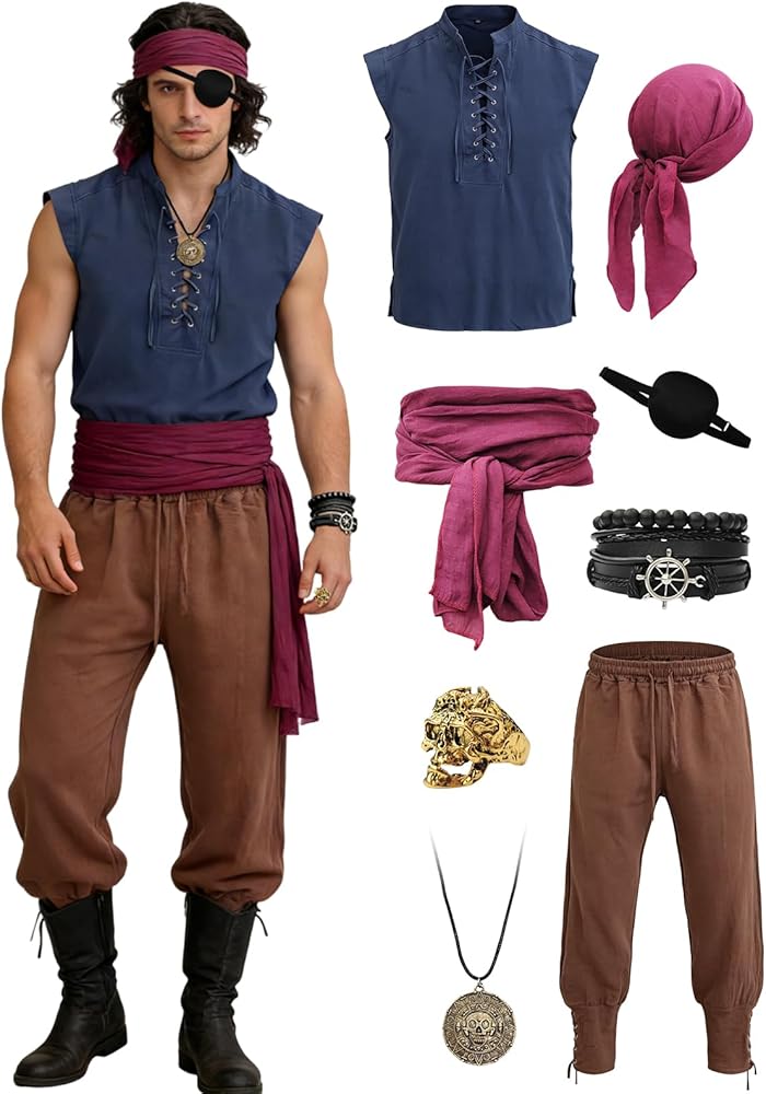 زي القرصان الكامل المكون من 8 قطع للرجال يتضمن قميص بدون أكمام بأربطة، وسروال برباط الكاحل، وحزام وشاح، وعصابة رأس، وقلادة جمجمة، وخاتم، وسوار، ورقعة عين. تم تصميم كل قطعة لخلق مظهر قرصان أصلي للهالوين أو الحفلات التنكرية أو حفلات القراصنة أو مغامرات LARP.