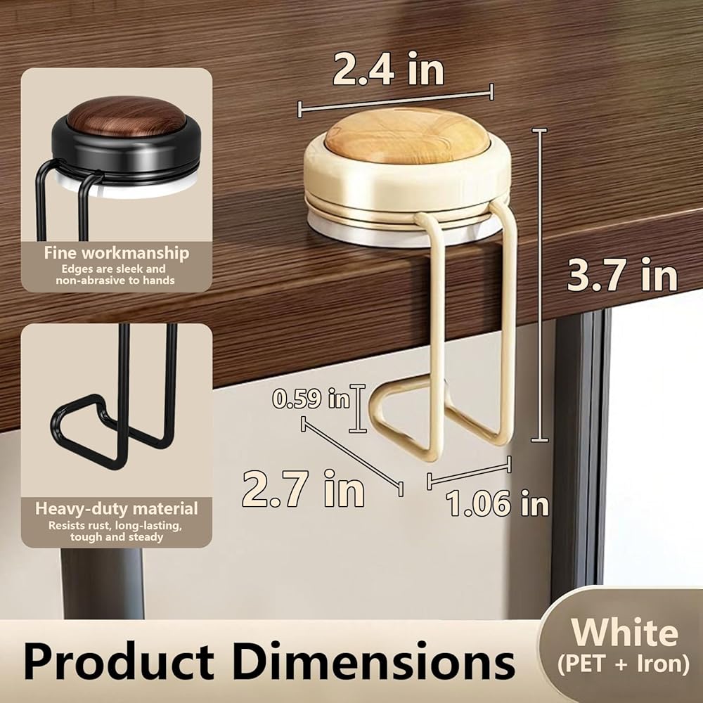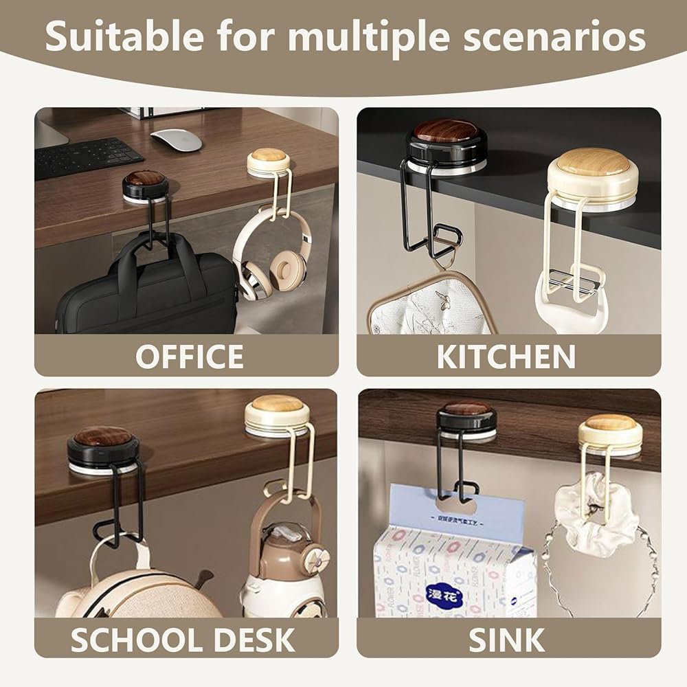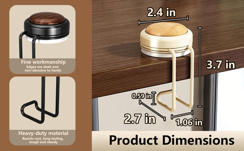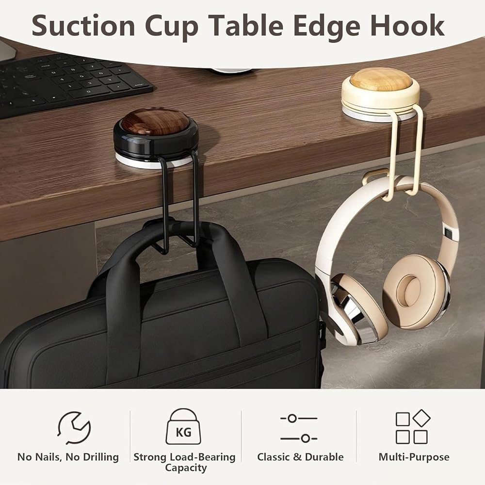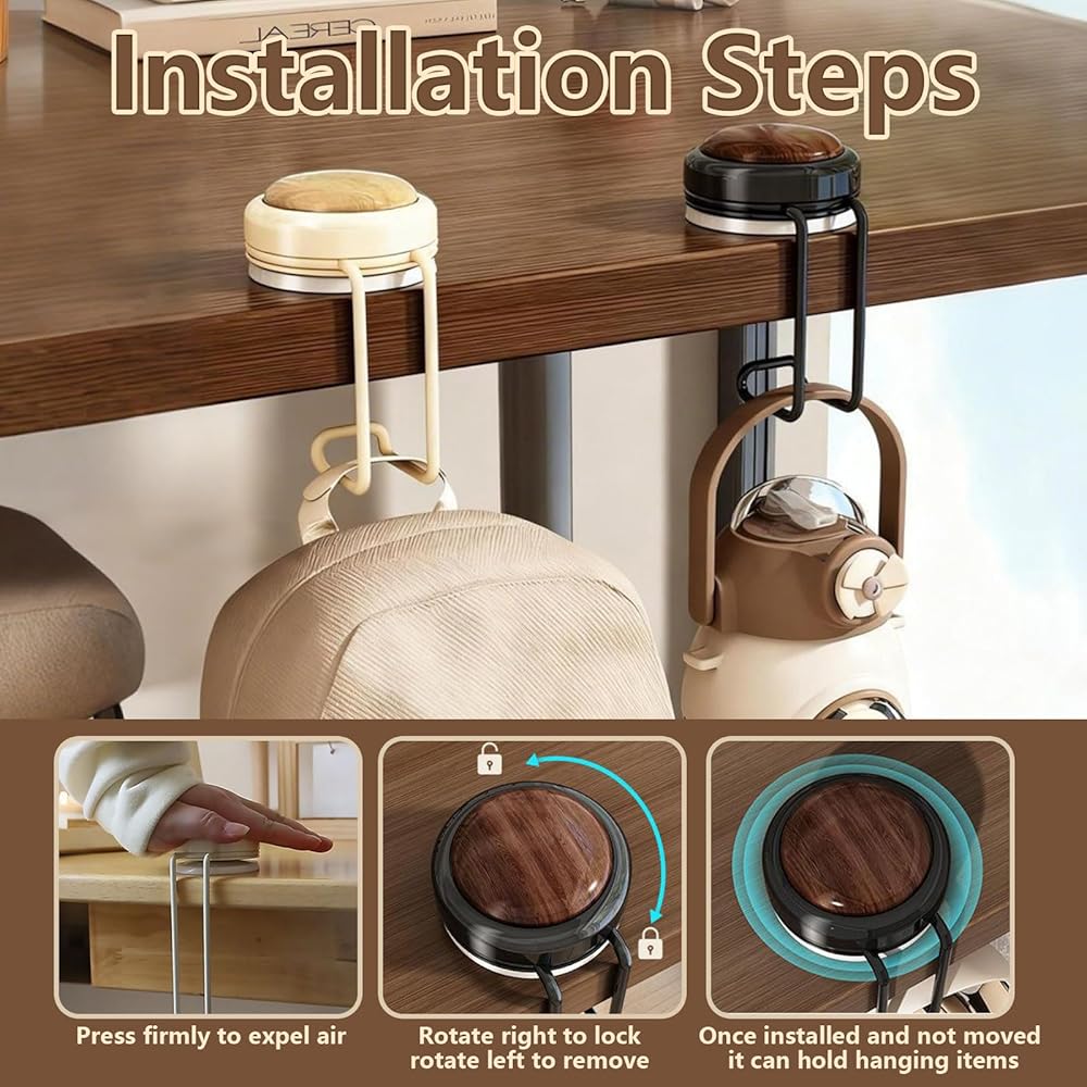 【شفط موثوق وتركيب بدون أدوات】مصممة بآلية كوب شفط عملية، تسمح مجموعة الخطاف هذه بالإعداد السريع - اضغط لأسفل لطرد الهواء ولفها في اتجاه عقارب الساعة للتأمين، دون الحاجة إلى أدوات إضافية. يناسب الطاولات وأسطح العمل التي يصل سمكها إلى 5 سم، والخيارات الأنيقة باللونين البني والأبيض تكمل أي ديكور، مما يجعل خطاف المحفظة للطاولة خيارًا عمليًا وأنيقًا