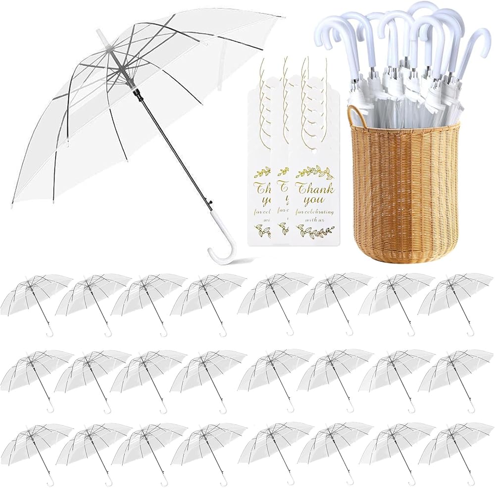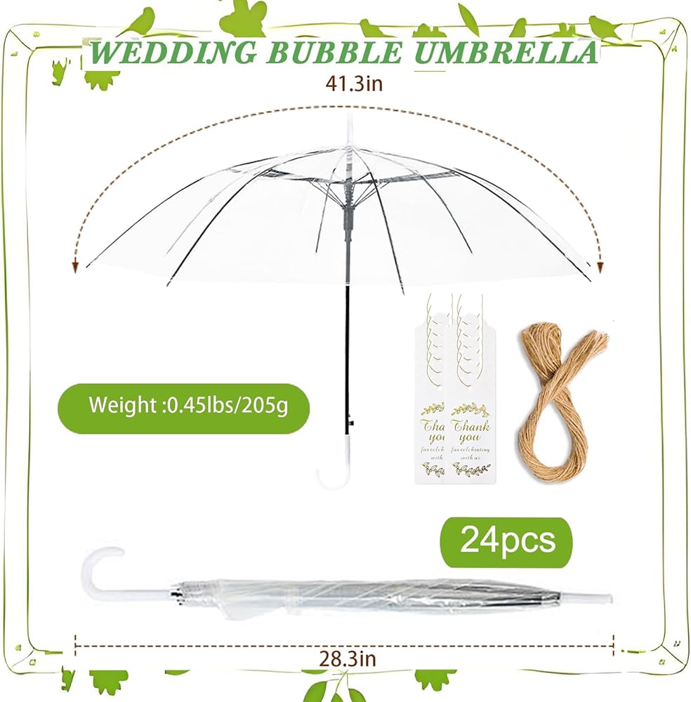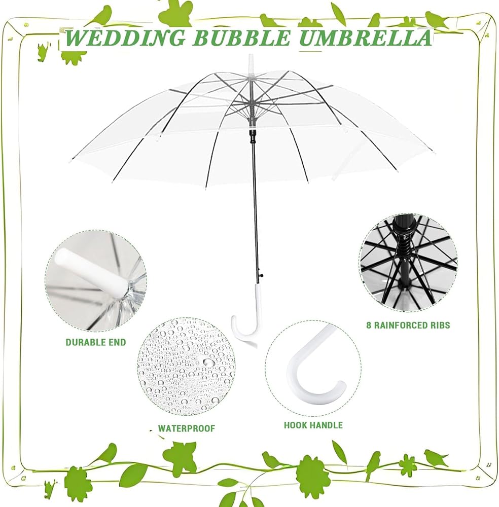 الكمية والحجم: سوف تحصل على 24 مظلة فقاعات شفافة للزفاف، كافية لتلبية احتياجاتك اليومية واستبدالها، كل مظلة لها طول قوس 52 بوصة، وقطر حوالي 34.5 بوصة، وطول مغلق حوالي 27 بوصة، توفر هذه المظلة الشفافة تغطية آمنة لرأسك وأكتافك من المطر والرياح. بالإضافة إلى ذلك، فهو خفيف الوزن للغاية، لذا يسهل على الأطفال حمله أيضًا.
