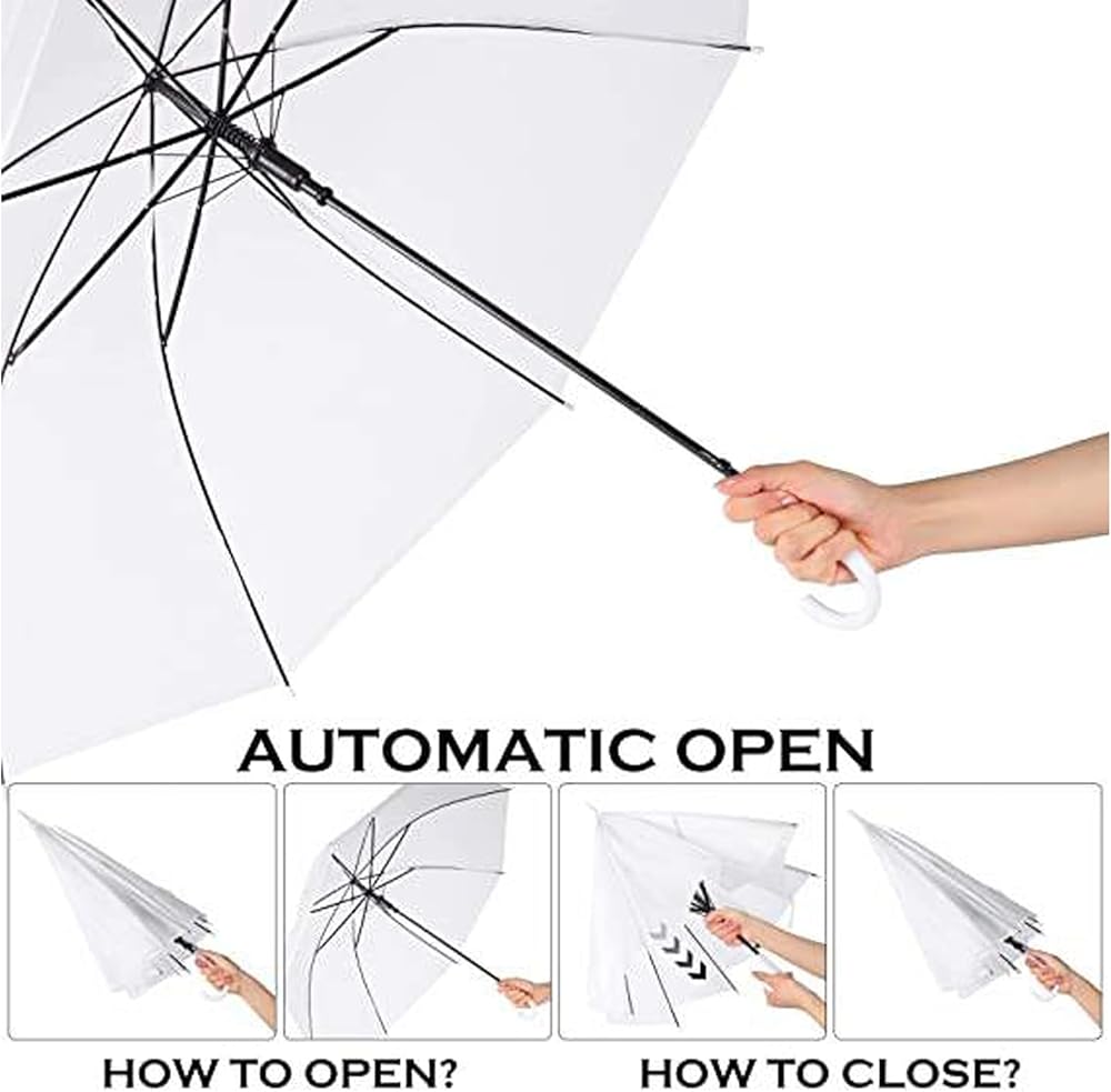 سهلة الاستخدام: تأتي مظلاتنا الشفافة بمقبض خطافي على شكل حرف J، ما عليك سوى الضغط على الزر لفتح مظلة الزفاف بسهولة وتبقى جافة. إغلاقه سلس تمامًا، مما يضمن أنه يمكنك تعبئته بسهولة حتى في المطر الغزير.