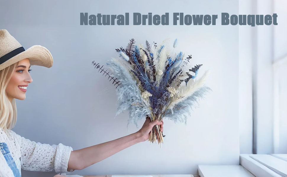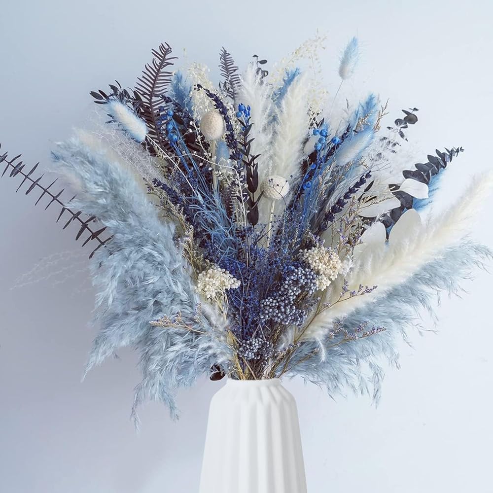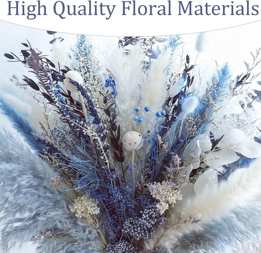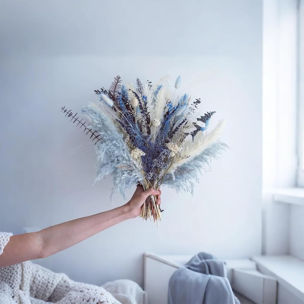 【زهور مجففة طبيعية 100%】: باقة الزهور المجففة مصنوعة من 15 زهرة وأعشاب محفوظة فريدة من نوعها، بما في ذلك البامبا المجففة وأوراق الأوكالبتوس وذيل الأرنب واللافندر وكرات بيلي والمزيد. تعكس الألوان الزرقاء والبيضاء بعضها البعض بأناقة وملمس.