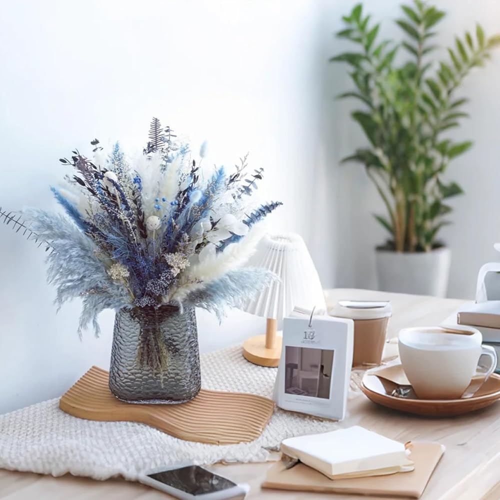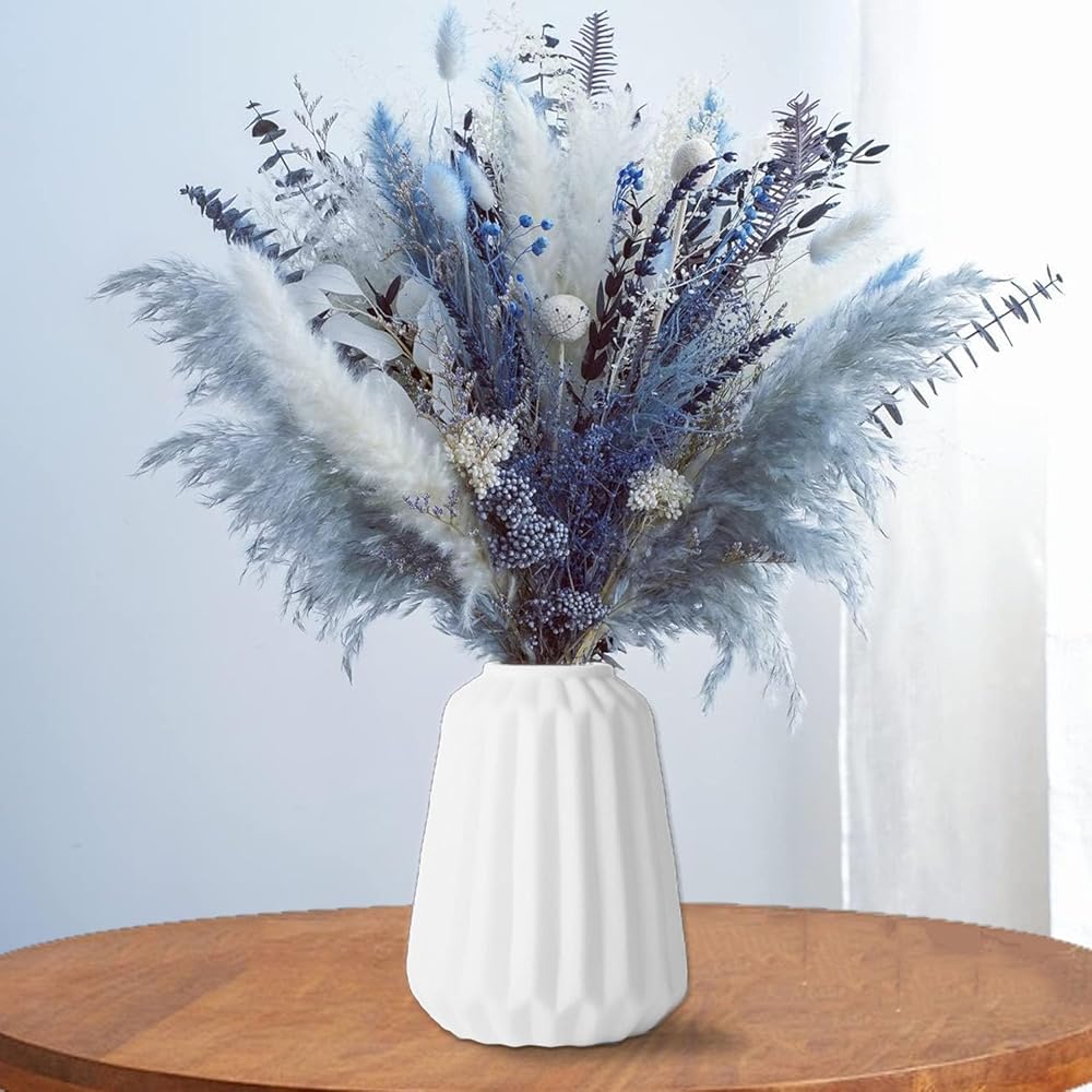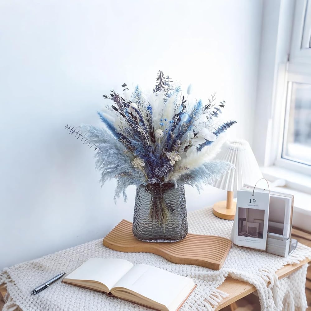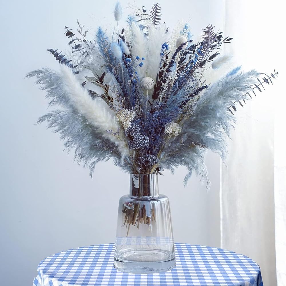 【زهور مجففة طبيعية 100%】: باقة الزهور المجففة مصنوعة من 15 زهرة وأعشاب محفوظة فريدة من نوعها، بما في ذلك البامبا المجففة وأوراق الأوكالبتوس وذيل الأرنب واللافندر وكرات بيلي والمزيد. تعكس الألوان الزرقاء والبيضاء بعضها البعض بأناقة وملمس.