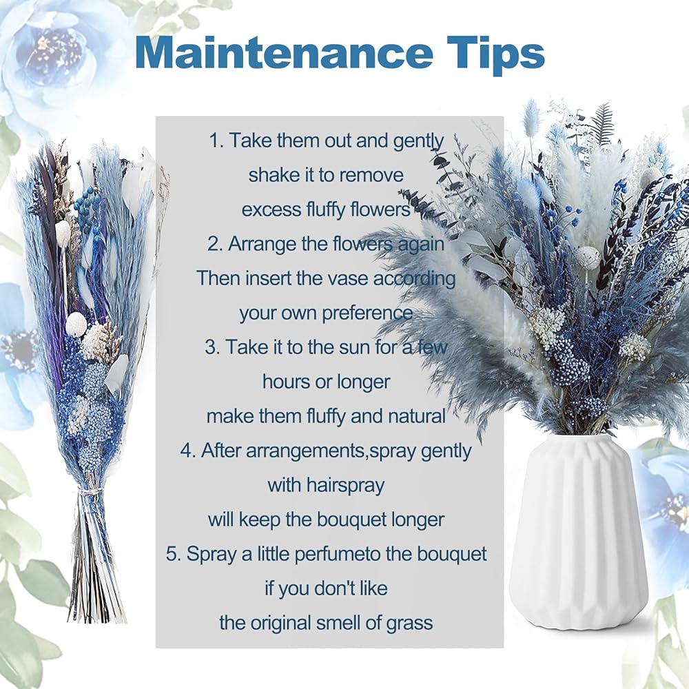 【لا حاجة إلى رعاية】: ديكور عشب بامباس مصنوع من مواد زهور عالية الجودة، مجففة بشكل طبيعي ومحفوظة علميًا، أنيقة وطبيعية على حد سواء، لا حاجة للري أو الصيانة، يمكن أن تدوم لعدة سنوات، عندما تتلقى الباقة المجففة، قم بهزها بخفة، واترك الزهرة في الشمس لمدة ثلاث إلى ست ساعات للسماح للشمس بنفشها، رش بعض مثبتات الشعر للحفاظ عليها منتفشة.