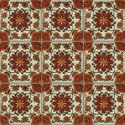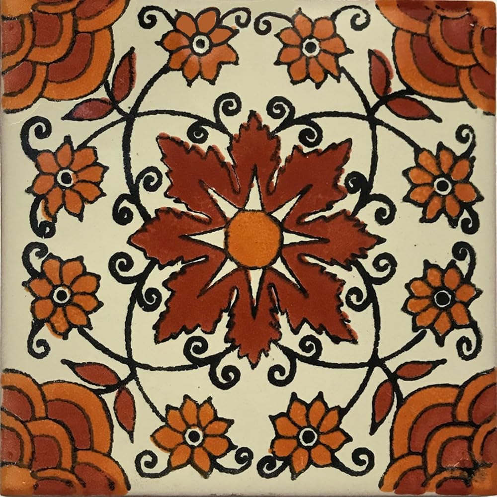 This Talavera clay tile has the four corners handpainted in red terracotta and yellow with mostly Mexican white background. The central part is a terracotta flower with a yellow center to create a unique fall look! The pictures show the patterns when four or more are put together and when a single tile line is put together for you to appreciate it better.DISCLAIMER:All of our Talavera tiles have a heavily hand-made process involved; as such, imperfections are expected. Color variations are to be expected from batch to batch. What you see on your screen might not be exactly what you will get, this is mostly due to several factors, among others: lighting when the picture was taken, lighting in your own monitor, but mostly changes in the glazes used between batches. All these factors are beyond our control. If in doubt, we recommend you to order a sample before committing to a bigger order.
