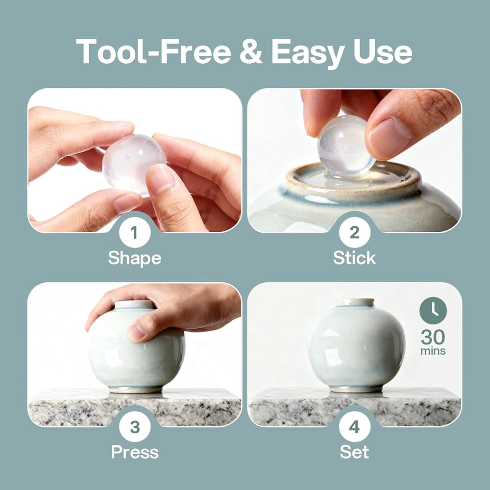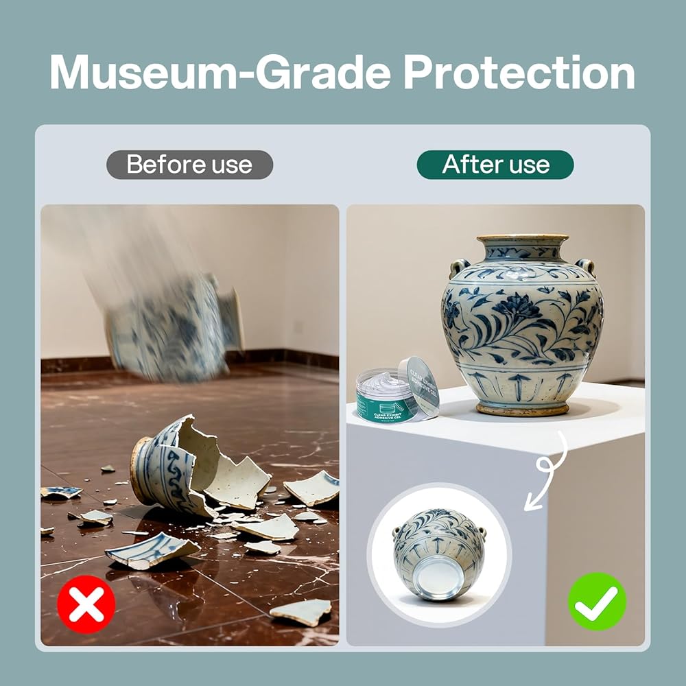 【أمان غير مرئي لمقتنياتك الثمينة】قم بتأمين مقتنياتك العزيزة والمزهريات الكريستالية والتماثيل الرقيقة باستخدام جل لاصق شفاف TQRR. تم تصميم هذا المعجون اللاصق المصمم على طراز المتحف لامتصاص الصدمات والاهتزازات، مما يخلق رابطة قوية على الأسطح المسطحة، مما يمنع العناصر من الانقلاب بسبب الصدمات العرضية أو الحيوانات الأليفة النشطة أو الهزات البسيطة. إنه يوفر ثباتًا موثوقًا للأرفف الزجاجية وخزائن العرض بينما يظل غير مرئي فعليًا، مما يضمن بقاء كنوزك مركز الاهتمام دون تشتيت المواد اللاصقة.