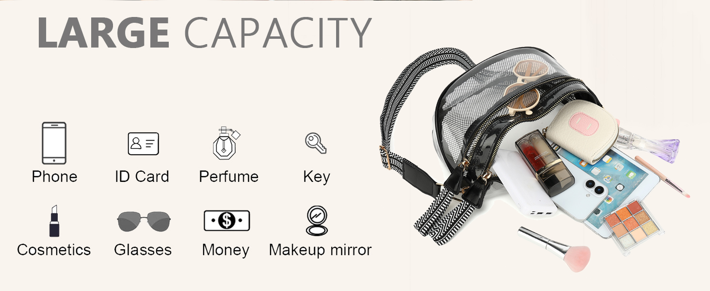 【سعة كبيرة】هذه الحقيبة الشفافة خفيفة الوزن وواسعة، مع حزام كتف قابل للفصل. هذا الملعب الشفاف المعتمد يتوافق تمامًا مع سياسة حقائب البطولة في الاستاد. ويمكن أيضا أن تستخدم كحقيبة يومية.