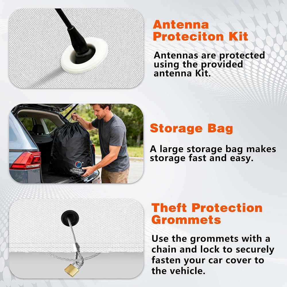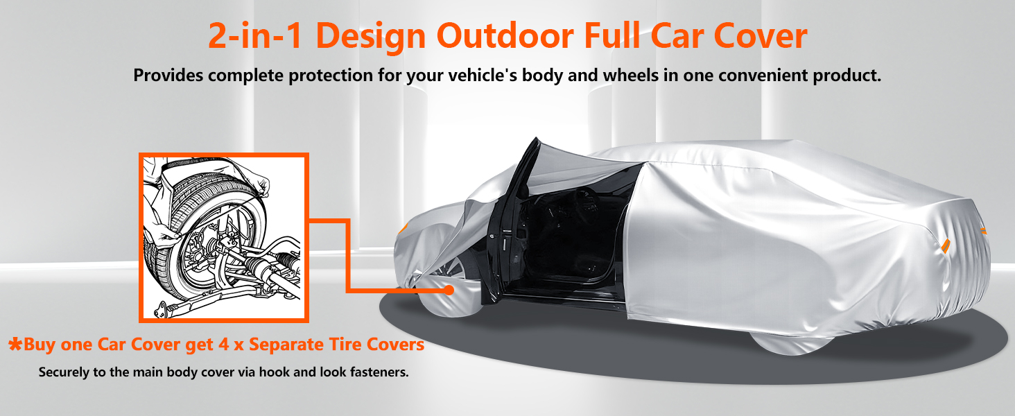 • غطاء سيارة الكل في واحد بتصميم مدروس: يوفر تصميمنا المبتكر 2 في 1 حماية شاملة لكل من جسم السيارة وعجلاتها من خلال حل واحد متكامل. (في انتظار الحصول على براءة اختراع) يتم ربط أغطية الإطارات بشكل آمن بغطاء الجسم الرئيسي باستخدام مثبتات الخطاف والحلقة، مما يوفر ملاءمة ثابتة وسلسة. كل غطاء سيارة مجهز بملحقات فاخرة، بما في ذلك دليل المستخدم، ورقعات الهوائي، والحلقات، وأربعة أغطية إطارات منفصلة وحقيبة تخزين كبيرة للتخزين المريح والموفر للمساحة.