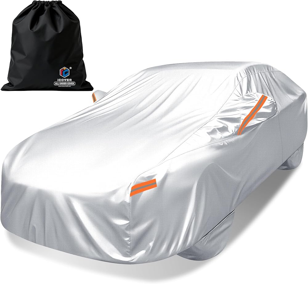 غطاء سيارة iCOVER، مقاوم للماء لجميع الأحوال الجوية لسيارة Toyota Camry، Honda Accord، BMW 5 Series، Mercedes E-Class، Audi A6 (الطول 192 بوصة إلى 198 بوصة) غطاء خارجي كامل خارجي مع أغطية إطارات قابلة للفصل