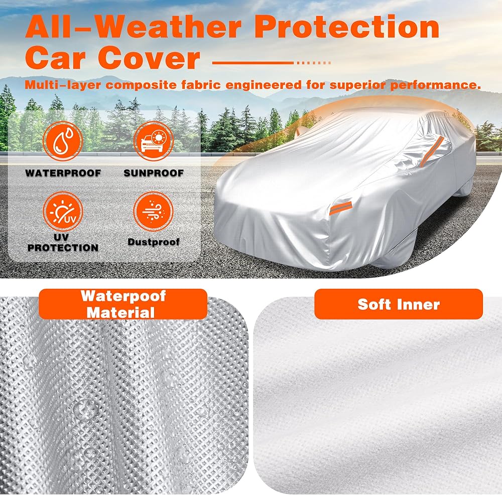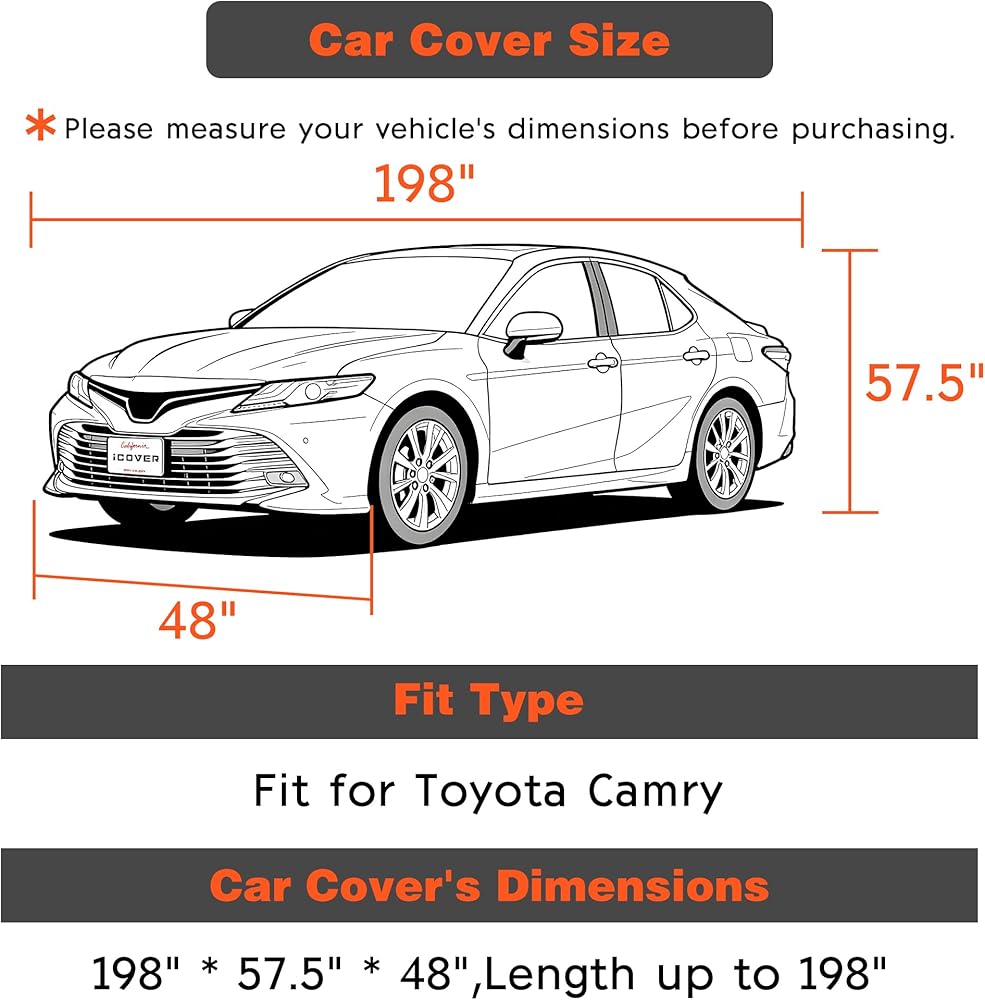 • غطاء سيارة للسيارات: مناسب لطول السيدان (192-198 بوصة). تم تأكيد أنها تناسب تويوتا كامري وأفالون | هوندا أكورد | نيسان ألتيما، ماكسيما | بي إم دبليو الفئة الخامسة (قاعدة العجلات القياسية) | مرسيدس بنز الفئة-E (قياسية) | أودي A6 (قياسي) | لكزس ES | كاديلاك CT5. يرجى قياس أبعاد سيارتك قبل الشراء.