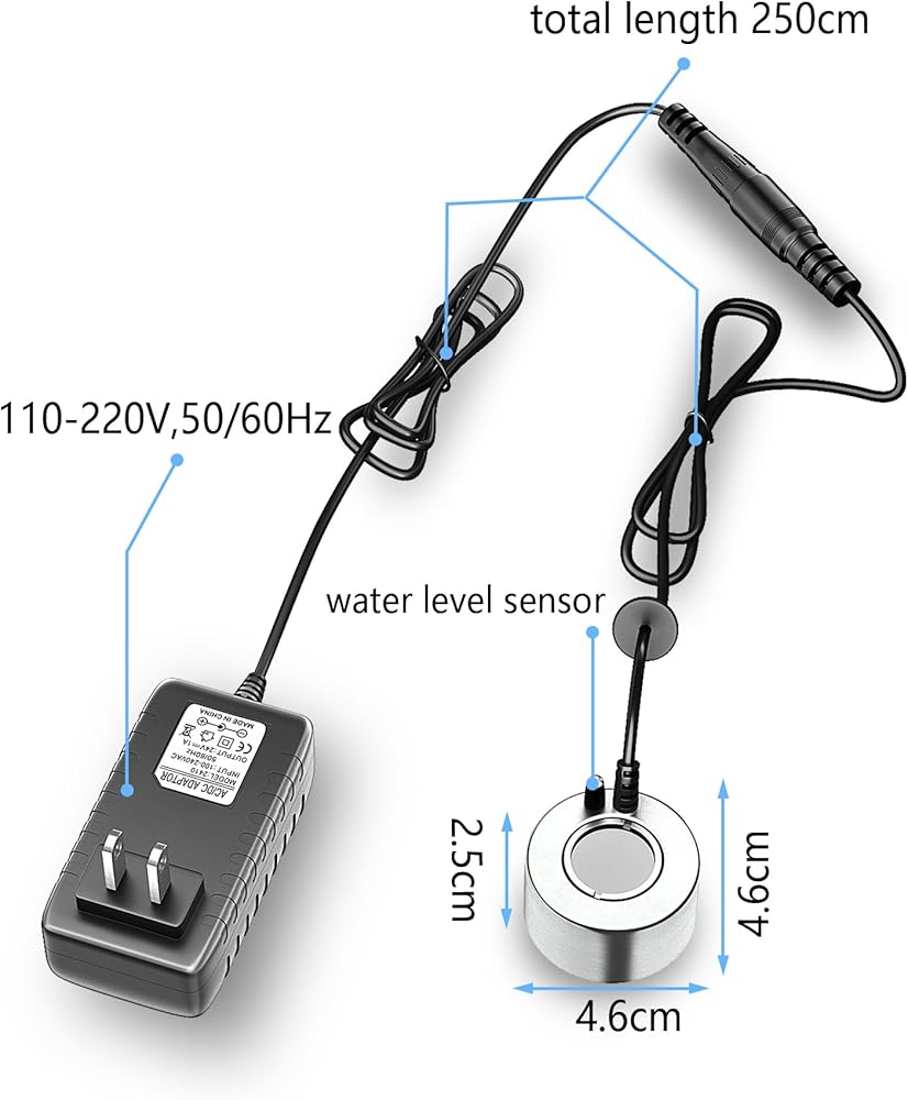 【طريقة الاستخدام الصحيحة】: تأكد من أن سطح الماء أعلى من مستشعر مستوى الماء. الحد الأقصى لحجم الضباب يحدث عندما يكون سطح الماء فوق الرذاذ بمقدار 2-3 سم. الحد الأقصى لساعات العمل المتواصلة هو 10 ساعات