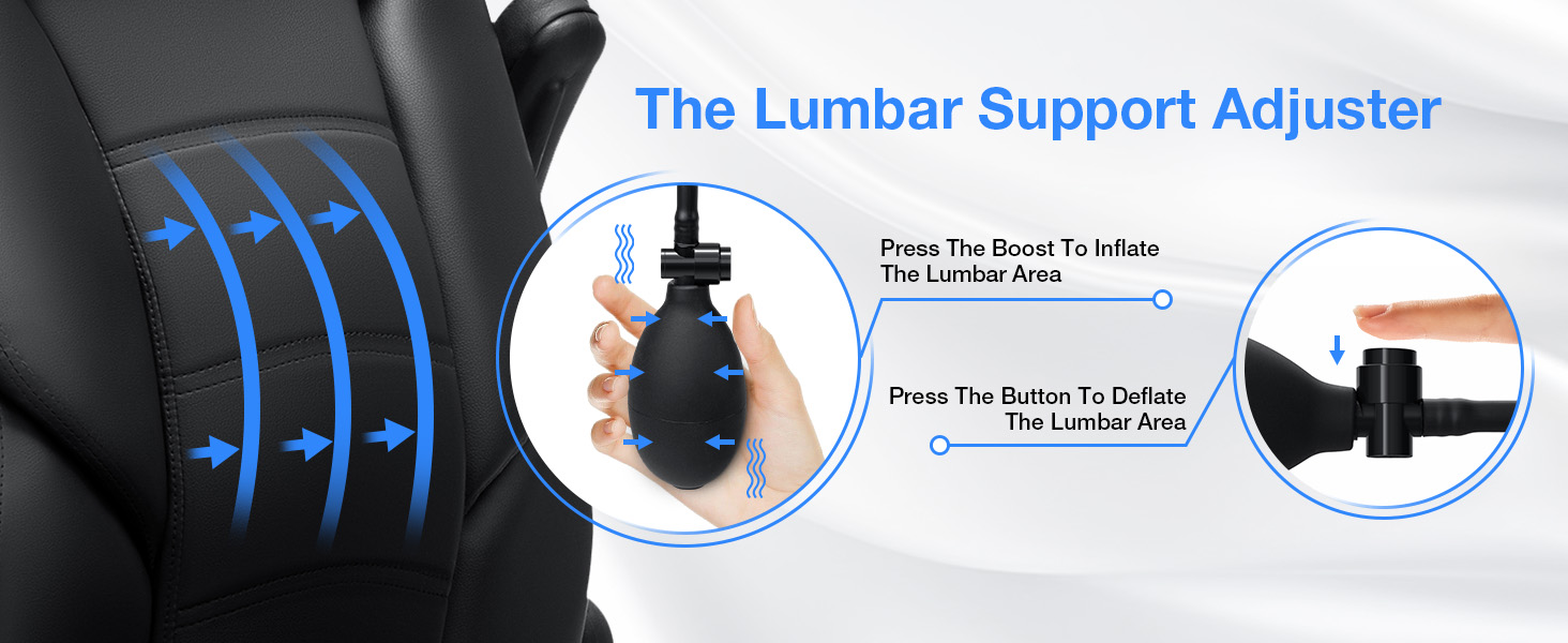【دعم قطني قابل للنفخ】يمكنك استخدام الوسائد الهوائية لنفخ منطقة أسفل الظهر في الكرسي حسب الحاجة لتوفير دعم أفضل لمنطقة أسفل الظهر. وسوف تعزز تجربة الجلوس الخاصة بك بشكل كبير، ولا مزيد من الألم أو التعب خلال ساعات طويلة من اللعب أو العمل