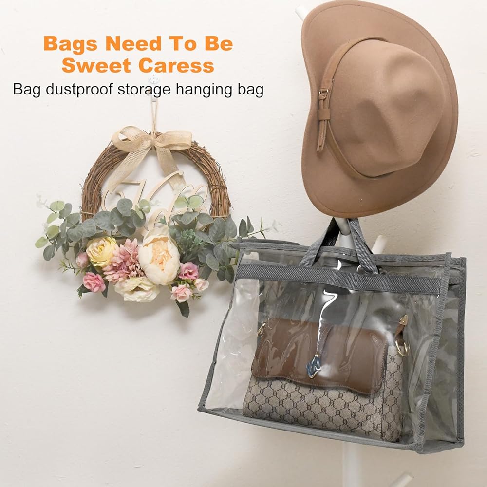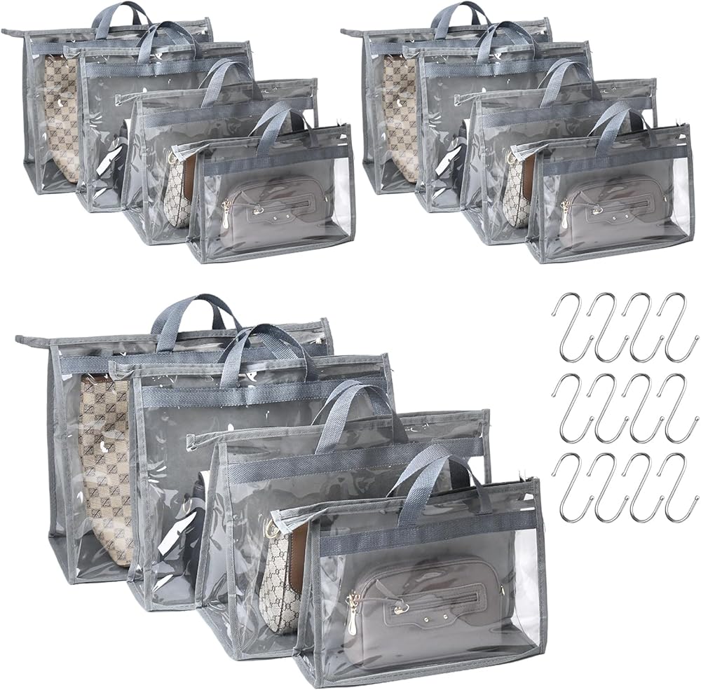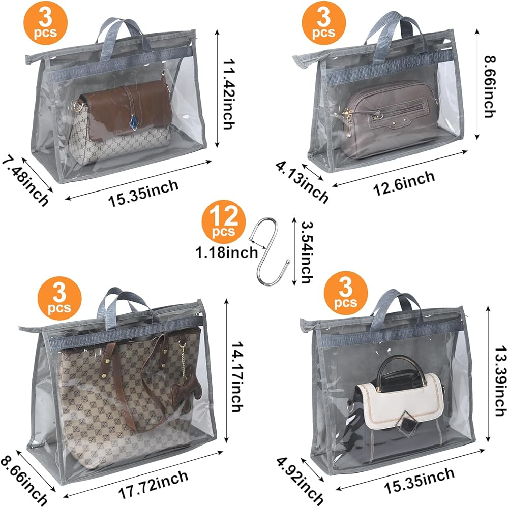 • 12 Dust Bags & Hooks: This 12-piece set includes 4 different sizes purse storage bag: 15.35"×7.48"×11.42", 12.6"×4.13"×8.66", 15.35"×4.92"×13.39", 17.72"×8.66"×14.17", and 12 metal hooks; Each purse dust bag features a handle for easy carrying and hanging