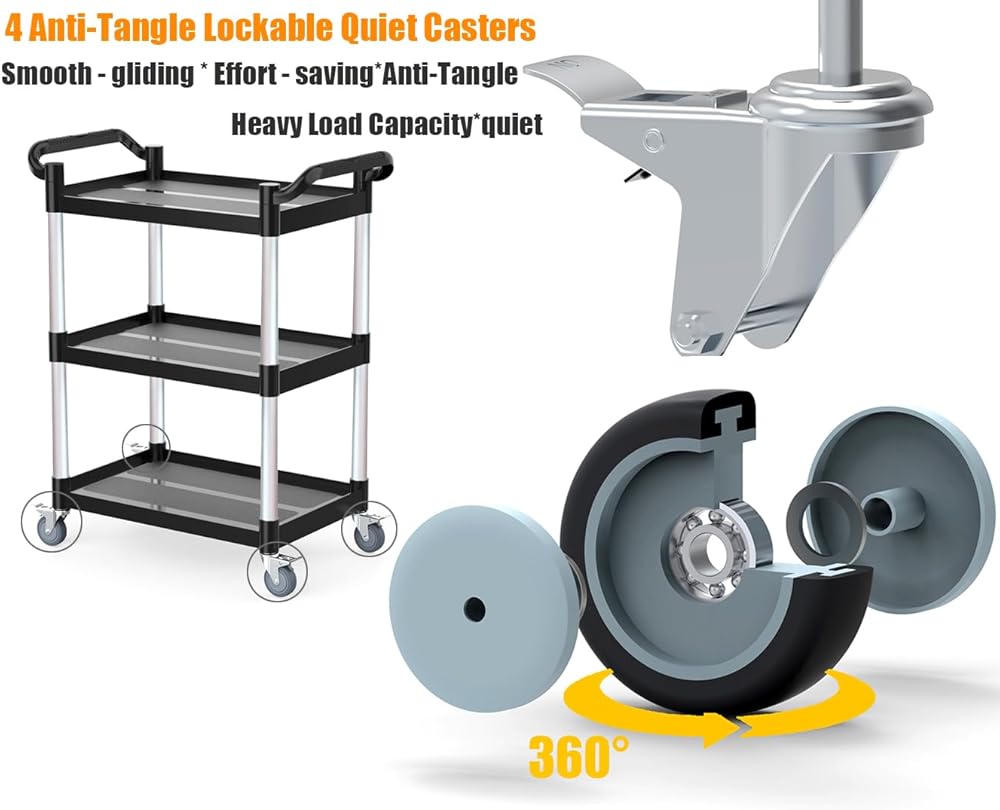 【4 عجلات هادئة مضادة للتشابك وقابلة للقفل】 مجهزة بـ 4 عجلات دوارة موثوقة وقابلة للقفل بزاوية 360 درجة، كل منها مزودة بمحامل صامتة لحركة سلسة ومنخفضة الضوضاء. تتميز هذه العجلات بقدرة تحميل قوية وتأتي مزودة بأغطية غبار لمنع تشابك الشعر والحطام والمواد السائبة الأخرى. مثالي للبيئات الحساسة للضوضاء مثل المطاعم والمكاتب والمستشفيات.