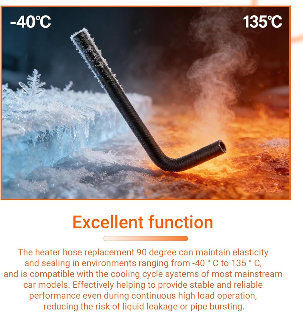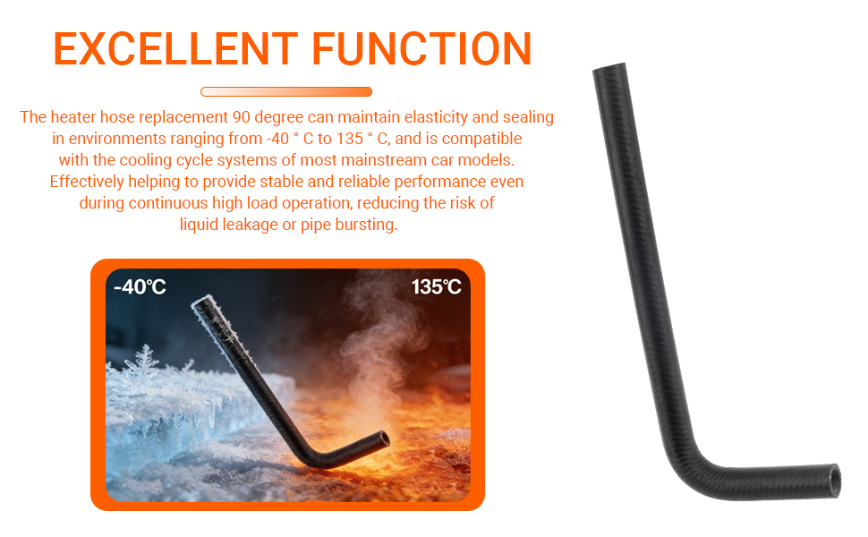 وظيفة ممتازة: يمكن لاستبدال خرطوم السخان 90 درجة الحفاظ على المرونة والختم في بيئات تتراوح من -40 درجة مئوية إلى 135 درجة مئوية، وهو متوافق مع أنظمة دورة التبريد لمعظم موديلات السيارات السائدة. يساعد بشكل فعال على توفير أداء مستقر وموثوق به حتى أثناء التشغيل المستمر ذو الأحمال العالية، مما يقلل من خطر تسرب السائل أو انفجار الأنابيب.