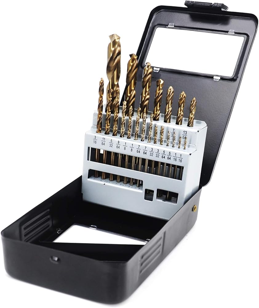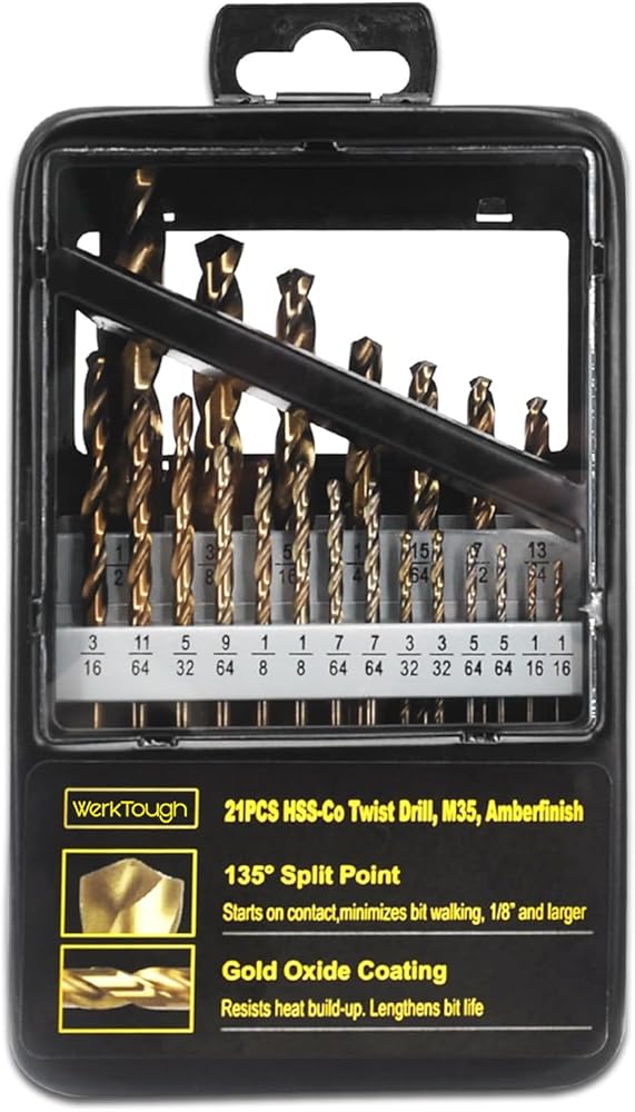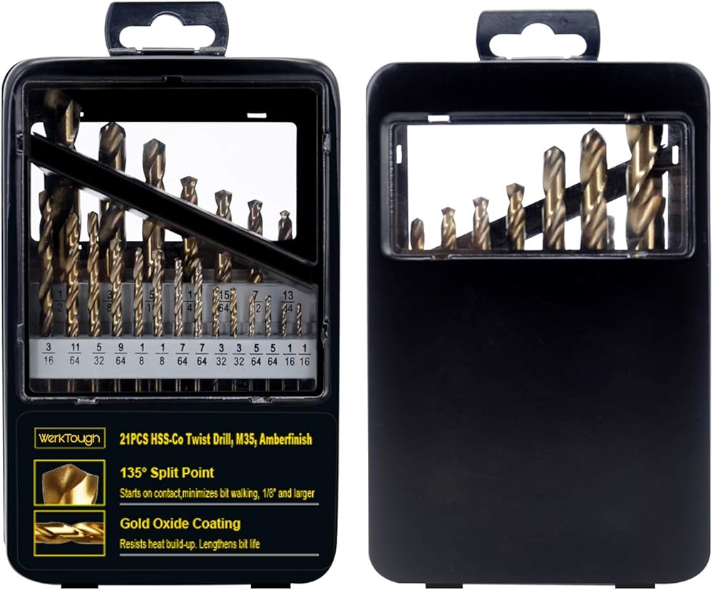مجموعة لقم مثقاب من التيتانيوم من werktough - 21 قطعة M35 Co 5% فولاذ عالي السرعة HSS لسبائك الفولاذ والمعادن الصلبة الأخرى، أرضية بالكامل مع لقم ثقب مقسمة بزاوية 135 درجة في صندوق معدني فاخر