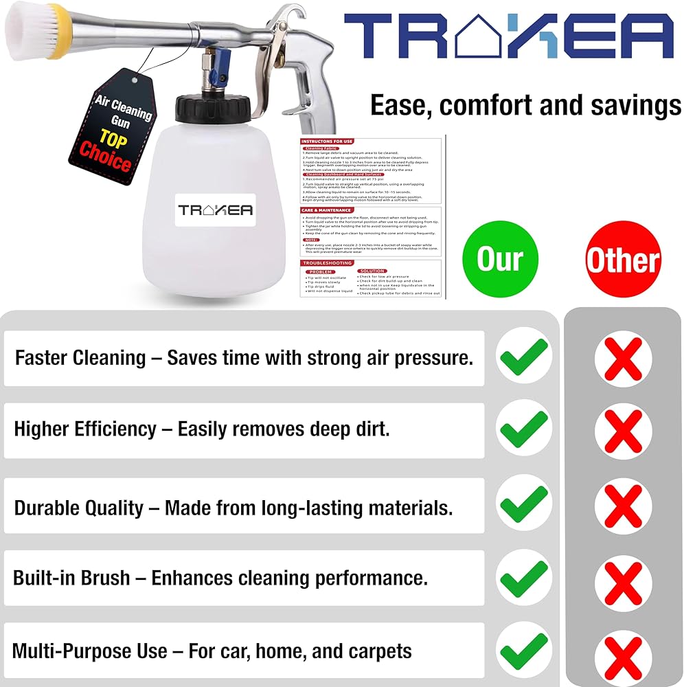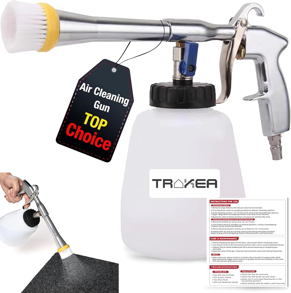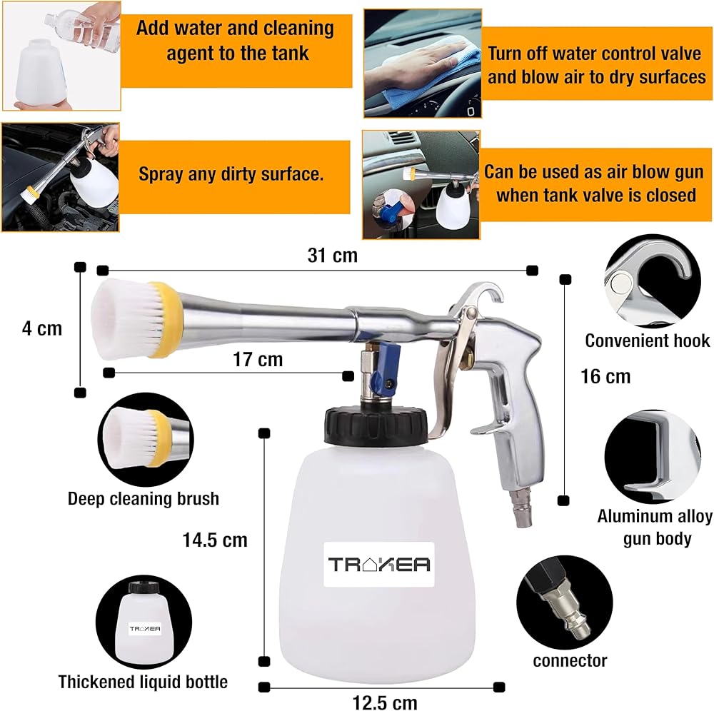 • تصميم متين ومرن: مصنوع من هيكل ألومنيوم قوي وخطاف مريح للتخزين، ويتضمن مسدس ضاغط الهواء ثلاثة موصلات (أوروبية وأمريكية وياباني) للتوصيل بسهولة بالضواغط الصناعية. زجاجة السائل سعة 1 لتر تعني أنه يمكنك التنظيف لفترة أطول دون الحاجة إلى إعادة تعبئة متكررة.