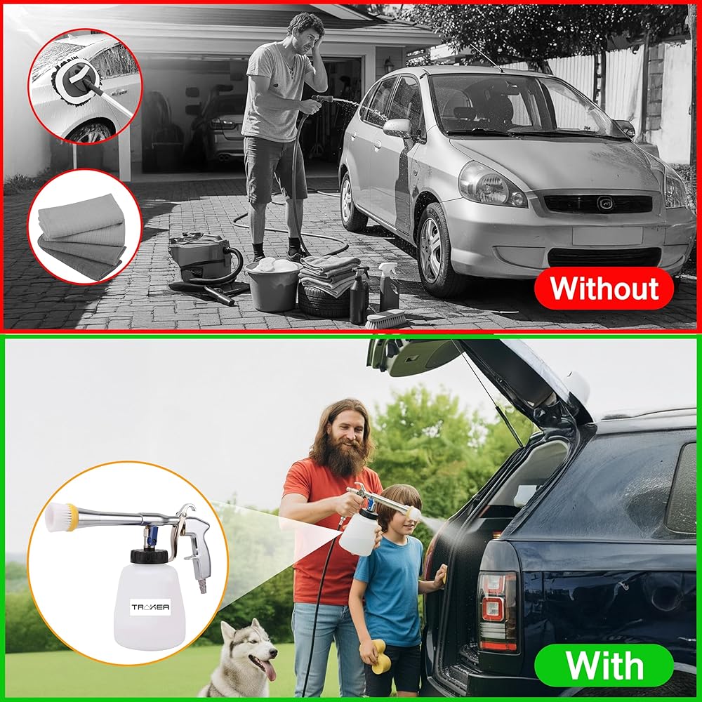 • سهل التوصيل والاستخدام: يعد استخدام مسدس تنظيف السيارة أمرًا بسيطًا - ما عليك سوى إضافة الماء أو المحلول، والاتصال بالضاغط، وضبط الصمام، واسحب الزناد. يعمل مع ضواغط هواء 6-9.2 بار ويتطلب موصل وخرطوم NPT قياسي 1/4. (ملاحظة: لا يتم تضمين موصل 1/4 NPT وخرطوم الهواء.)