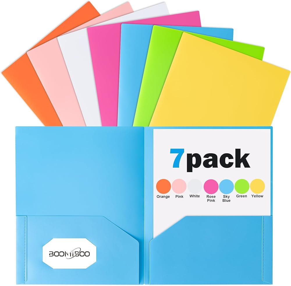 مجلدات بلاستيكية ملونة مع جيوب من BOOMIBOO (7 عبوات، ألوان زاهية متنوعة)، مجلدات ملفات متينة شديدة التحمل مع فتحة لبطاقة العمل، مجلدان جيب للعمل المدرسي والمكتب، حجم الحروف