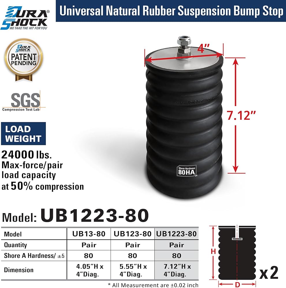 【Package Contents and US Based Company】: Package of rear bump stops includes UB1223(Pair), Screw kit x2 (10 MM Full Threaded SS Stud Bolt- 60/45/35mm, SS Washer, SS Nylon Insert Jam Nut, MS Nut). DuraSHOCK bump stop patent pending US design and support. In stock with lifetime technical assistance.