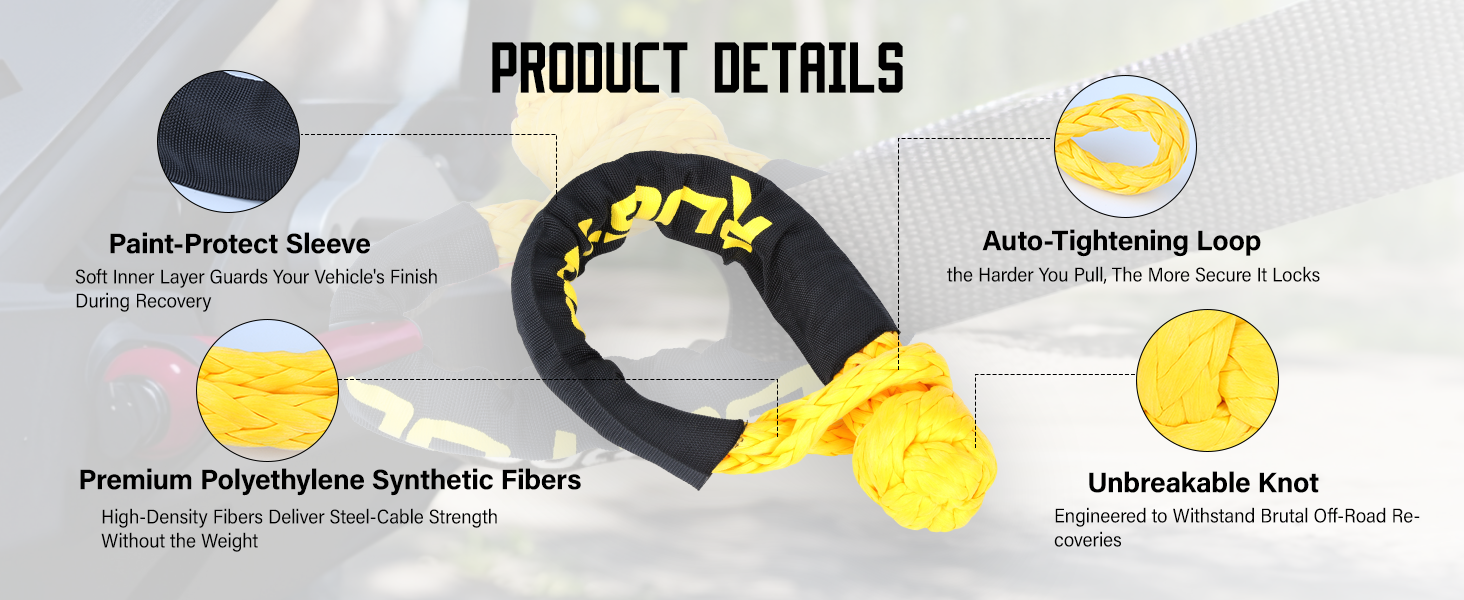 تضييق ذاتي لتحقيق أقصى قدر من الأمان: يتميز بتصميم حلقة مغلقة يتم شدها تحت الحمل، مما يضمن عدم انزلاق القيد الناعم أو ارتخائه أثناء الاستخدام. هيكل ربط Rugtol الاصطناعي الناعم يجعل استعادة السيارة أسرع وأكثر أمانًا وأكثر كفاءة - خاصة عند إقرانها بحبل سحب أو حزام سحب حركي.