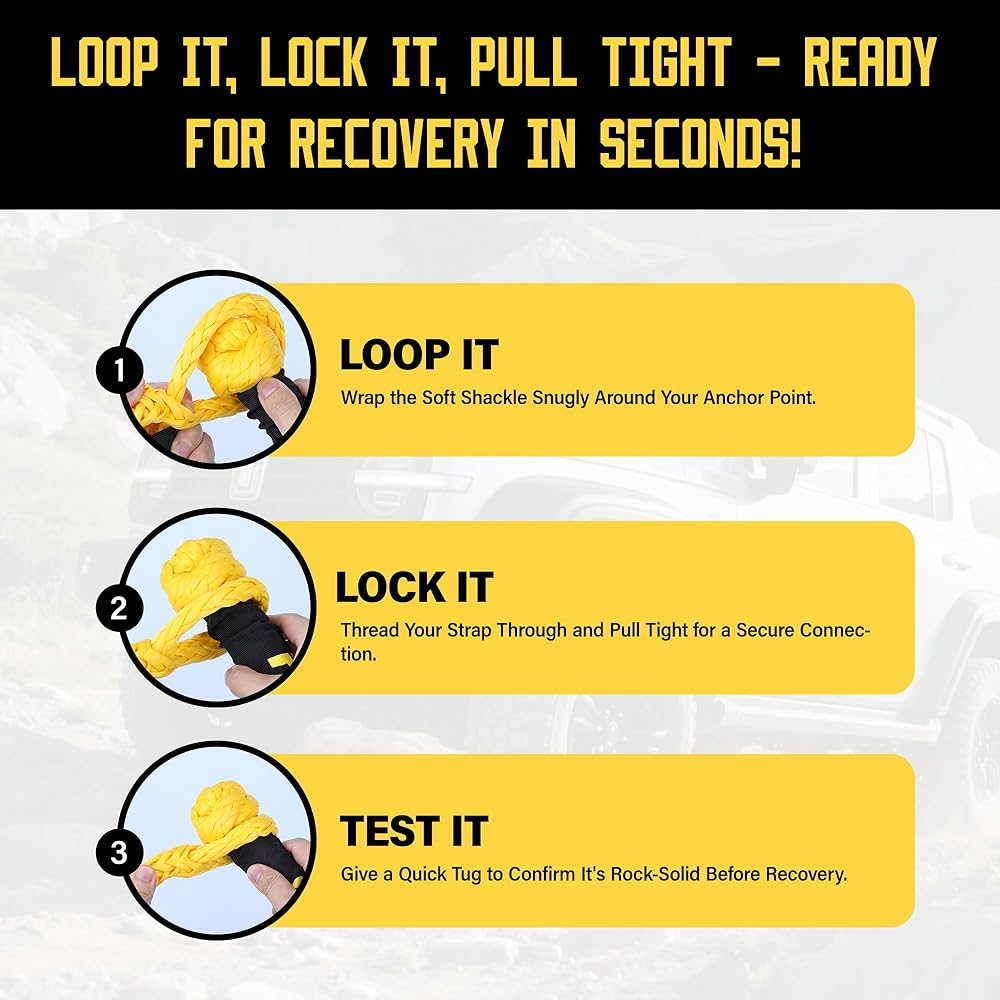 تركيب سريع في 3 خطوات: مصمم للاستخدام السريع والسهل: ما عليك سوى لفه وخيطه وسحبه. لا توجد أدوات مطلوبة. يضمن هذا القيد الناعم للتعافي استجابة أسرع أثناء حالات الطوارئ، مما يتيح لك نشر معدات الاسترداد في ثوانٍ عندما تكون هناك حاجة ماسة إلى حبال السحب أو خطوط الرافعة.