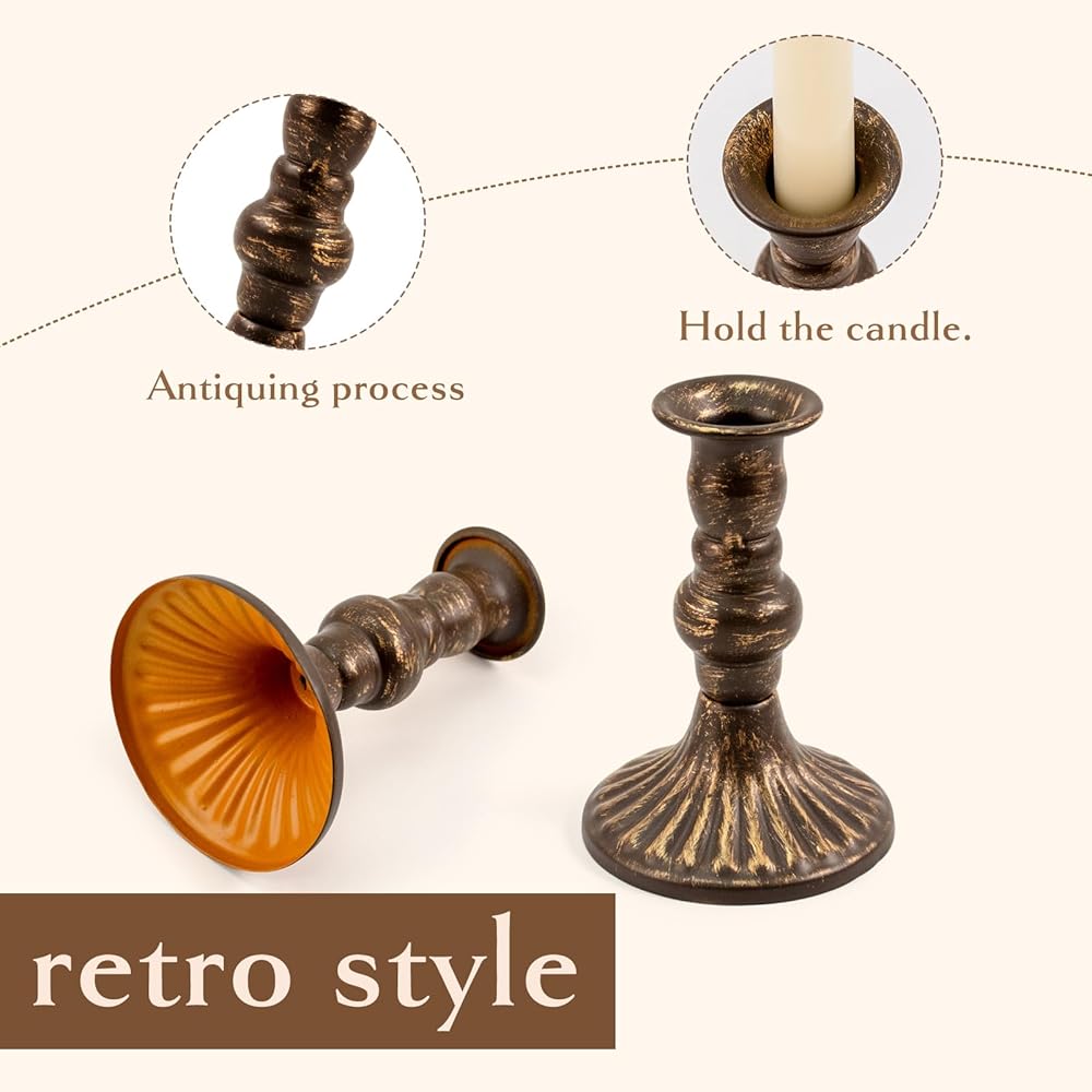 Living Room Focal Point: Place the pair side-by-side on a fireplace mantel or stagger them on a media console. As the candlelight flickers, the warm metallic glow interacts with the firelight (or screen light), creating an instant backdrop for family conversations and shared stories. This adds a serene and intimate, retro-chic tone to your living room. Dining Room Ambiance: Whether for a weekday dinner or a festive feast, use them as the anchor of your table centerpiece. Paired with pillar candles of varying heights or floral arrangements, they create an irreplaceable sense of dining ceremony. The copper gold finish reflects the feast and candlelight, making every toast more memorable and painting a picture-perfect gathering for family and friends. Bedroom Serenity: Position a single holder on a nightstand or dressing table as a dedicated scent diffuser or gentle nightlight. The soft glow dancing on the vintage metal surface fosters a relaxing atmosphere conducive to unwinding and peaceful sleep, adding a touch of gentle security to your personal sanctuary. Study & Entryway Accent: On a bookshelf nook or entryway console, they serve not only as exquisite decor but as a silent declaration of your taste. Welcoming you home with the first glance of warmth or accompanying moments of quiet reading, they elevate the overall texture of your space in the subtlest yet most significant way. The set of two holders offers flexible decorating possibilities. Symmetrical placement embodies grace and harmony, while asymmetrical grouping or pairing with other decor (like books, trays, or seasonal items) allows you to create casual, layered artistic vignettes. The sturdy metal construction ensures durability, and the design optimized for pillar candles also securely holds taper candles, fulfilling all your visions of light and beauty.