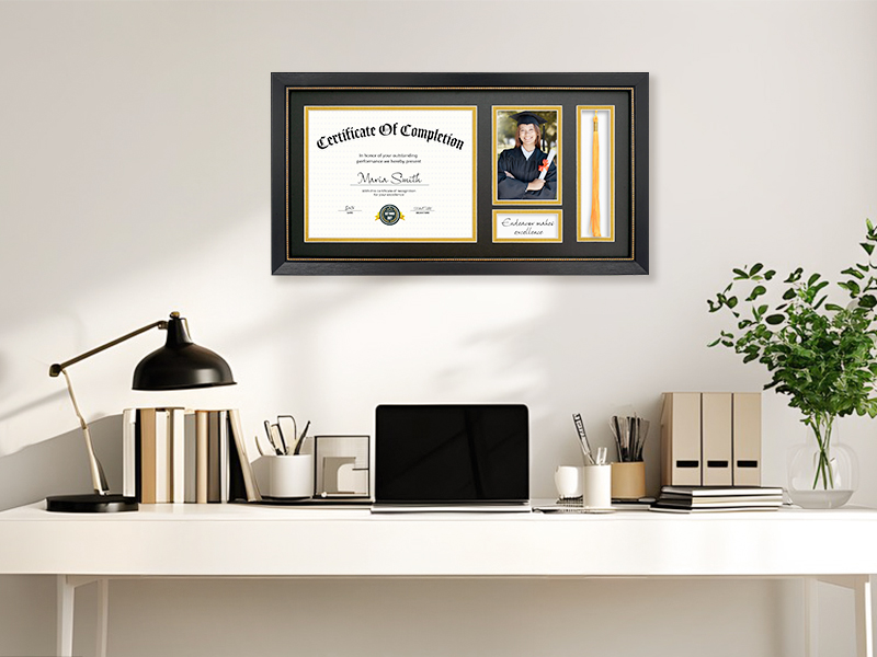 التصميم والحجم: تم تصميم الإطار مقاس 12.8 × 20.3 بوصة لعرض صورة دبلوم مقاس 8.5 × 11 بوصة وصورة تخرج مقاس 4 × 6 بوصة، كما يحتوي على فتحة حصيرة مقاس 1.7 × 3.7 بوصة لعرض الكلمات التي تريد تركها. مع تصميم إطار بسيط ولكن كلاسيكي، جنبًا إلى جنب مع الزجاج الحقيقي والحصائر المزدوجة السوداء فوق الذهبية، فهو يناسب تمامًا شهادتك ويجمد ذاكرتك الخاصة.