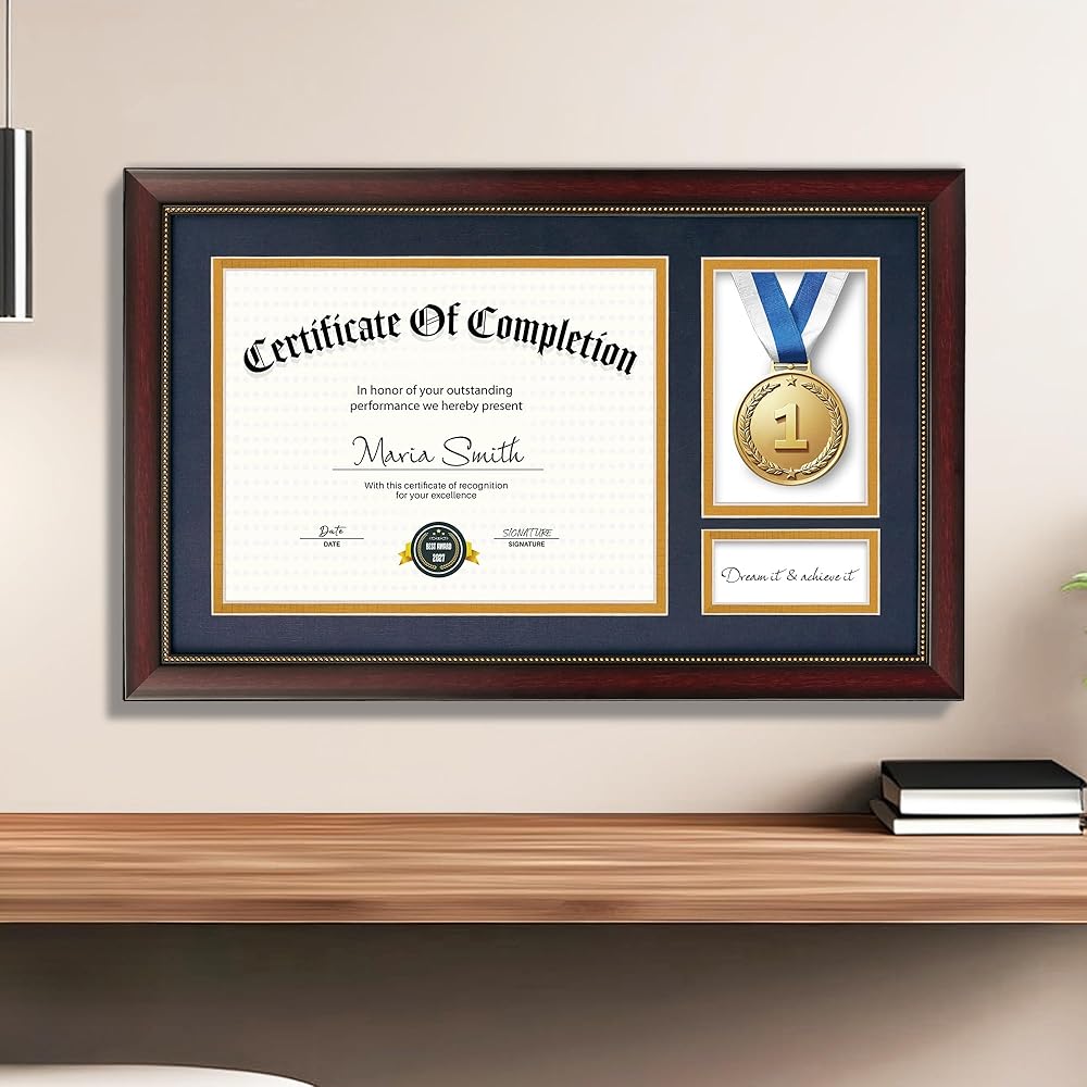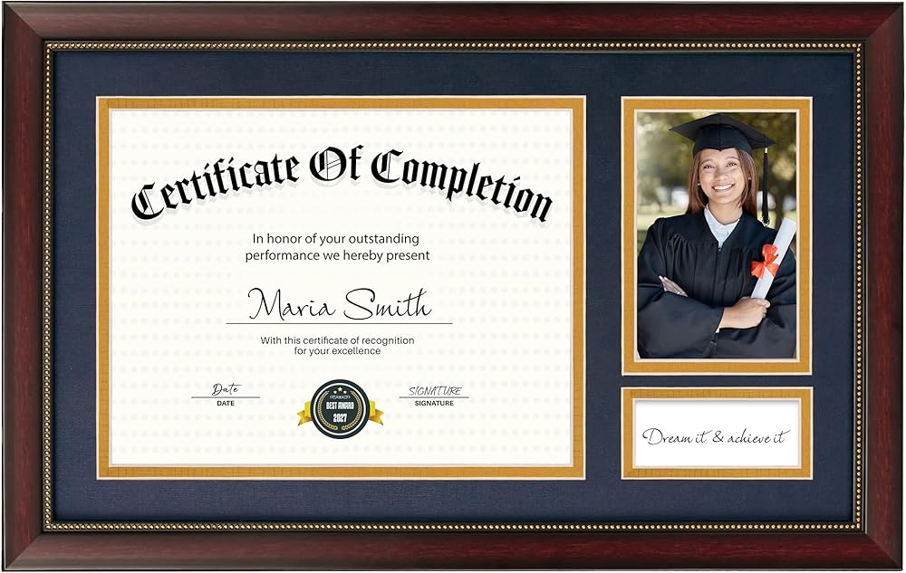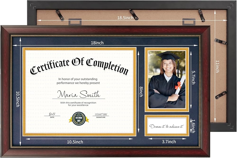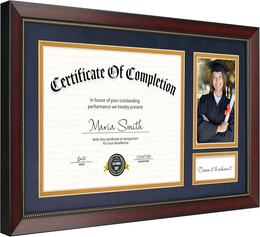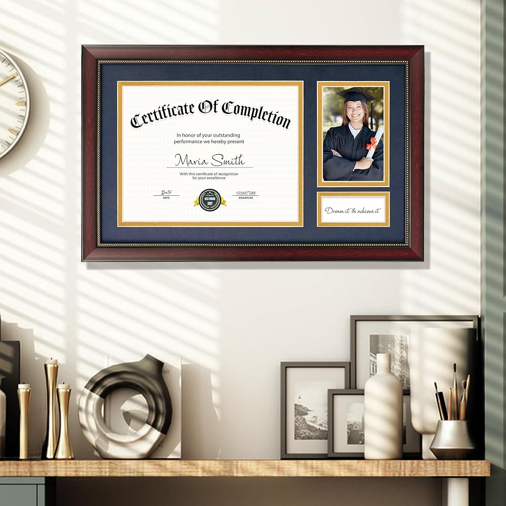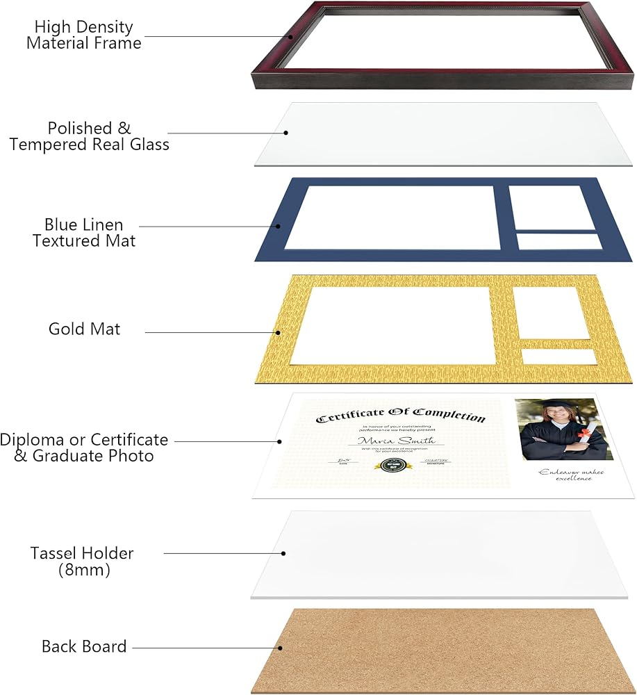 إطار خريج مقاس 11 × 18.5 لوثيقة شهادة مقاس 8.5 × 11، وعرض شهادة دبلوم مقاس 8.5 × 11 وصورة خريج مقاس 4 × 6، زجاج حقيقي، إطار من خشب الماهوجني مع سجادات مزدوجة باللون الأزرق فوق الذهبي