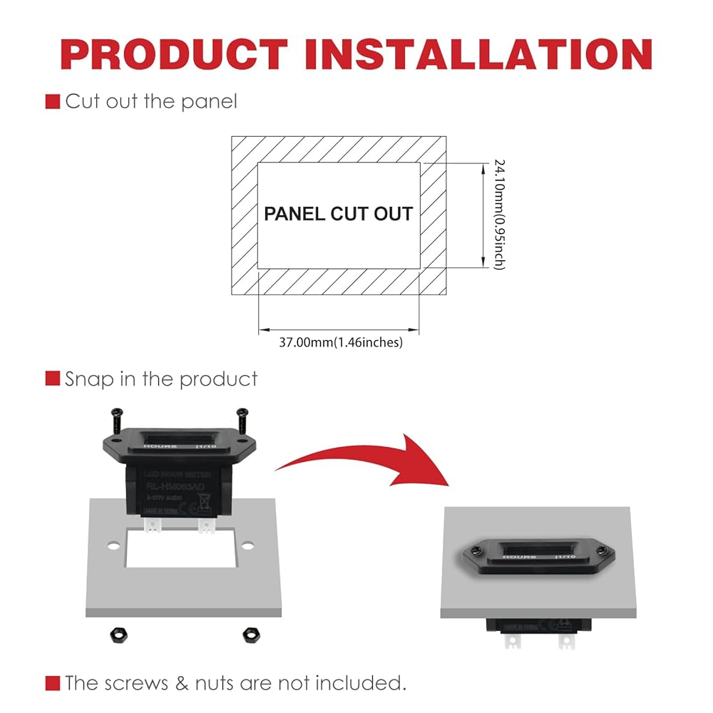 • EASY INSTALLATION : Drill-in and snap-in by panel cut-out size: 37.50mm*24.50mm(1.48 inches*0.96 inch);Easy to connect the external power equipment to start the working by the 2 pins(positive and negative are not divided)