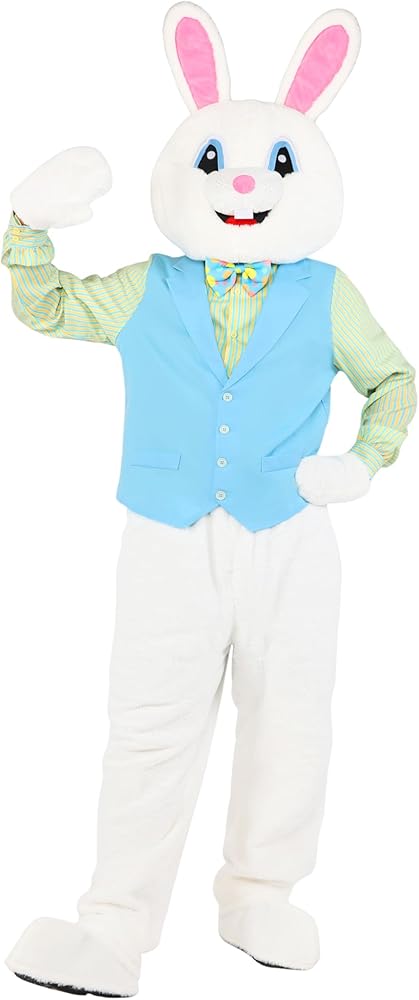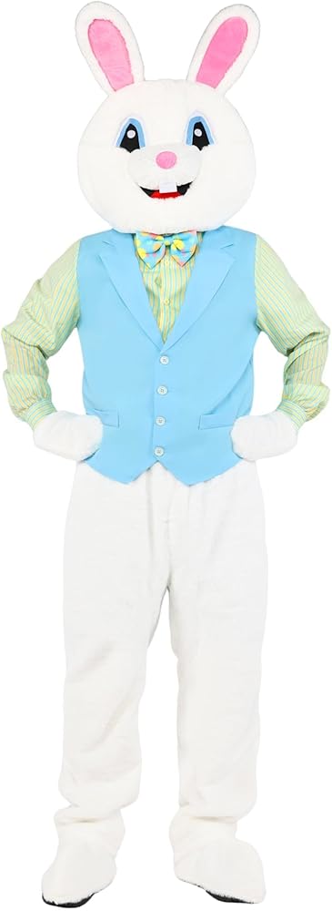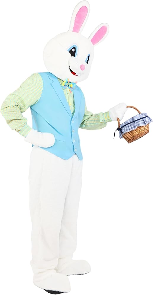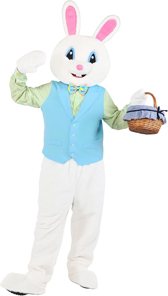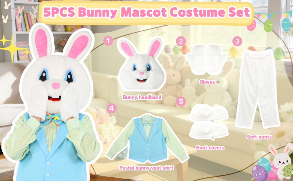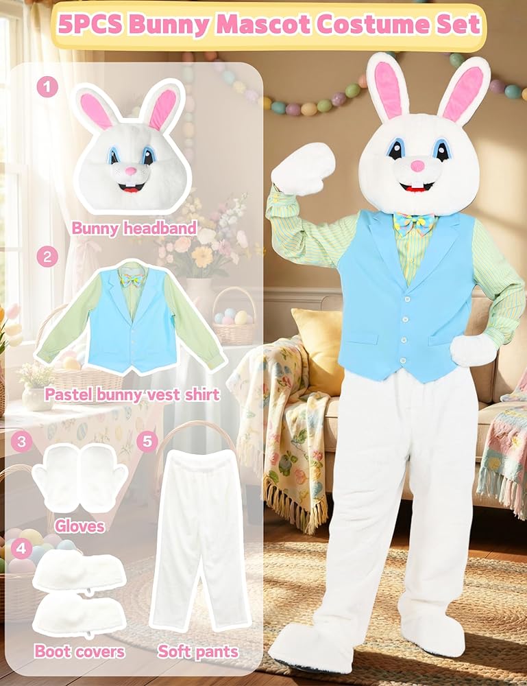 • 5PCS Deluxe Bunny Mascot Costume Set:This matching bunny costumes for women men set includes a bunny head, pastel bunny vest shirt, plush pants, white gloves and boot covers for a complete coordinated look. Designed for versatility, the adult easter bunny costume plus size can be easily paired with mens easter suits or other easter rabbit costume styles for group events, promotions, and holiday appearances.Basket is for display only and is not included