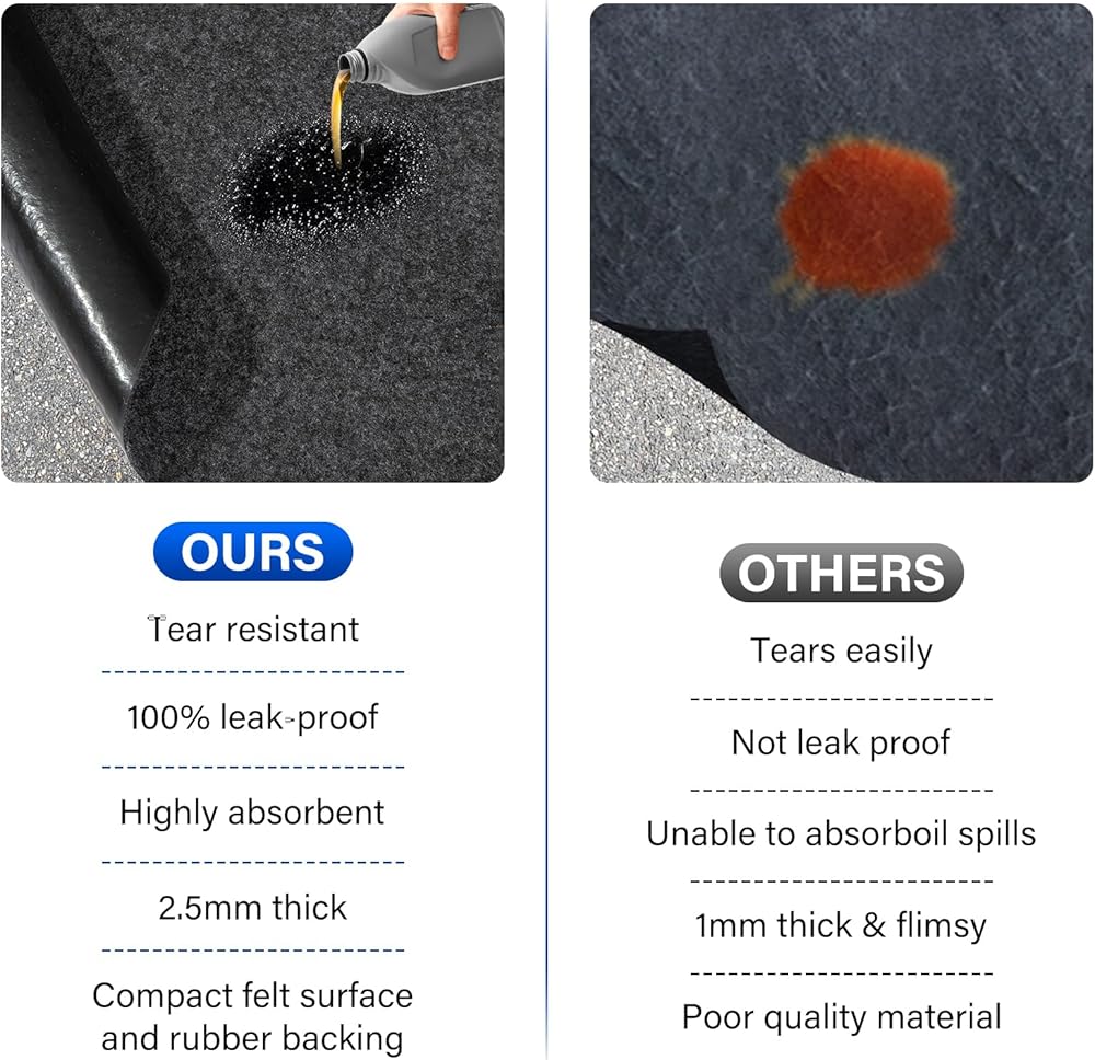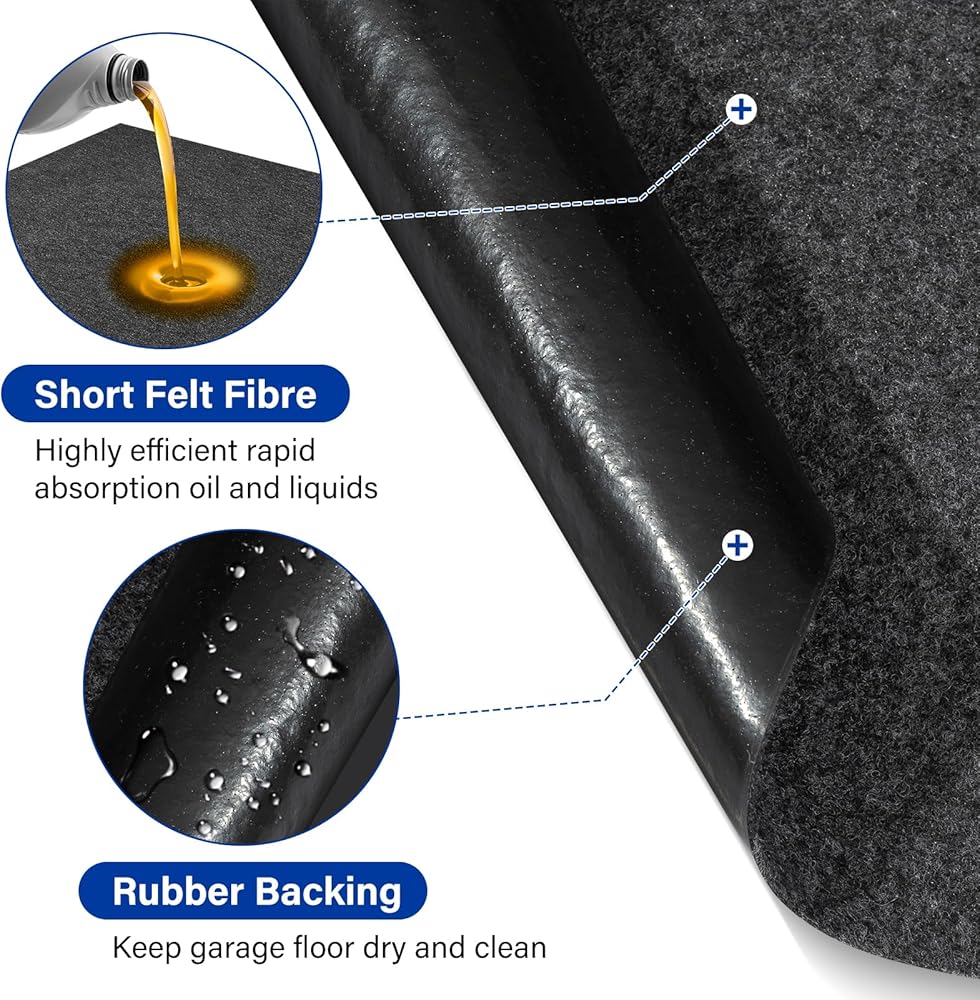 الحماية الأرضية: سجادات أرضية المرآب تمتص الزيت وسائل الفرامل وسوائل السيارات الأخرى، وتحمي أرضية المرآب الخاص بك من البقع والتسربات. سجادات المرآب السطحية مصنوعة من لباد عالي الكثافة، وهو مقاوم للاهتراء ومقاوم للتمزق، ويمكنه امتصاص الشحوم والسوائل المختلفة بسرعة وكفاءة، كما يحمي أرضياتك من الطين والمطر والثلج ومسارات الإطارات، بحيث تظل أرضيات المرآب الخاصة بك نظيفة وسليمة.