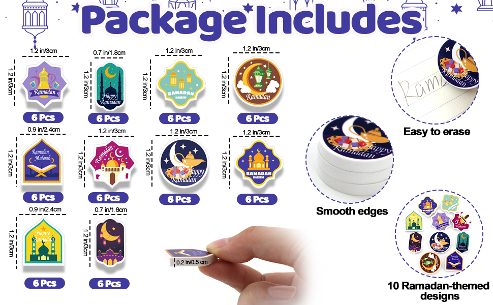 • 【مجموعة ممحاة رمضان والعيد】سوف تحصل على 60 ممحاة ذات طابع رمضان في 10 تصميمات فريدة (6 من كل منها). مع كمية كبيرة وتنوع مبهج، هذه المجموعة مثالية للمشاركة أو تقديم الهدايا أو الاستخدام الشخصي طوال الموسم وما بعده.