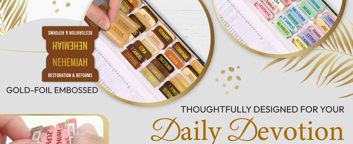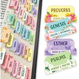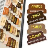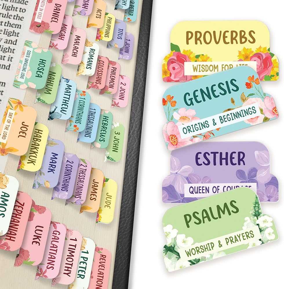 مجموعة منظمة كاملة مكونة من 66 علامة تبويب: تتضمن 66 علامة تبويب مغلفة للعهد القديم والجديد عبر 11 ورقة مجمعة حسب أقسام الكتاب المقدس، بالإضافة إلى الإشارات المرجعية الزهرية وأوراق الملصقات الملهمة؛ تم ترتيبها من أجل محاذاة نظيفة وتطبيق سهل