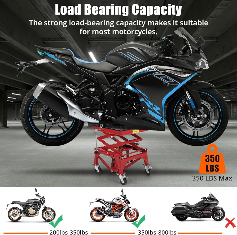 High Load Capacity: Safely lifts up to 350 lbs, making it appropriate for a wide range of vehicles including street bikes, cruiser bikes, touring motorcycles, ATVs, UTVs, and dirt bikes.