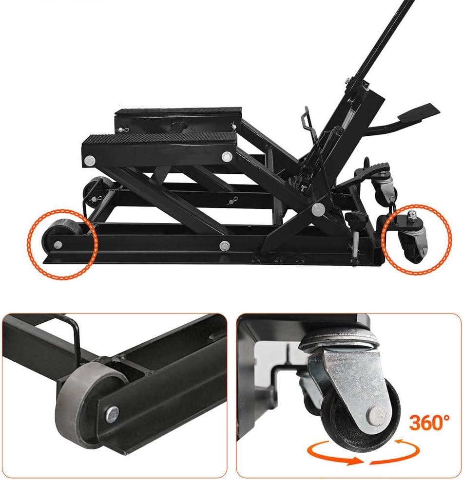 1500 رطل رافعة هيدروليكية للدراجات النارية، رافعة مقصية ATV طاولة رفع دراجة نارية محمولة مع 4 عجلات، حامل رافعة هيدروليكي يعمل بالقدم للدراجات النارية ATV UTV Powersports