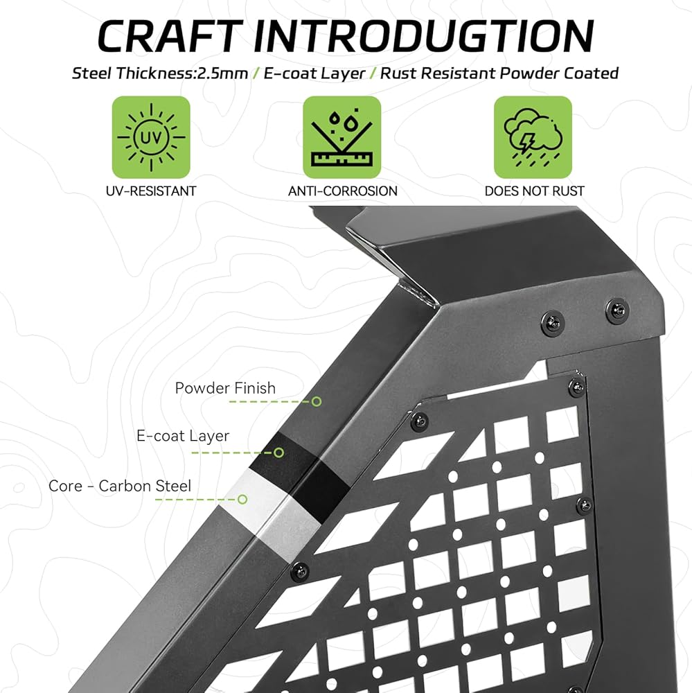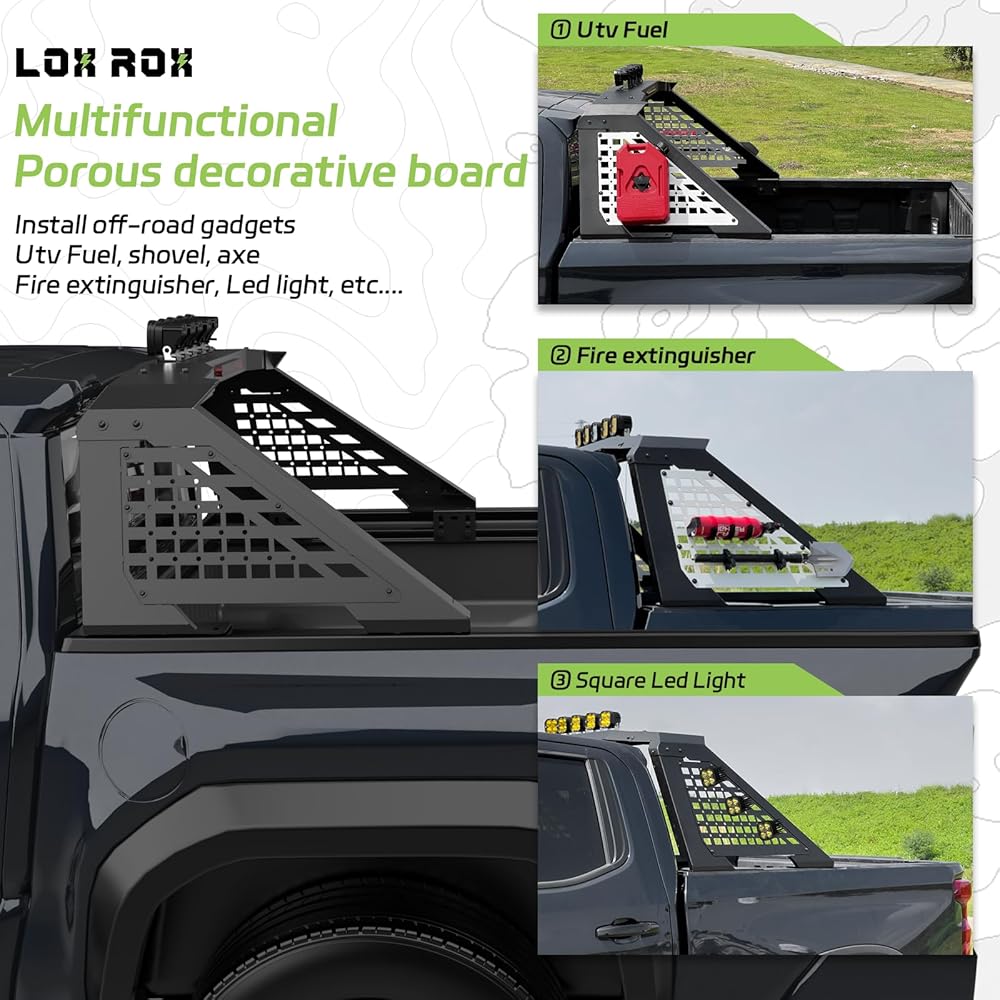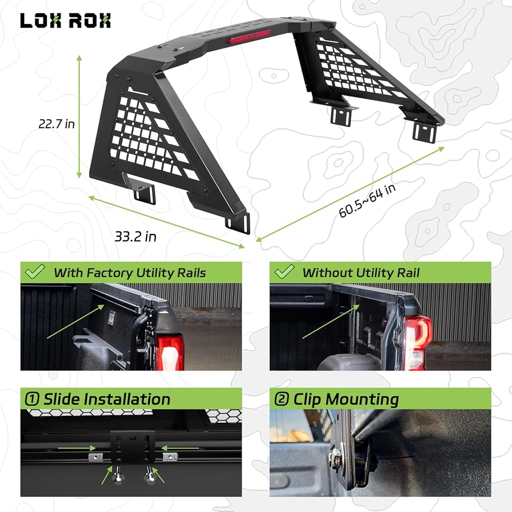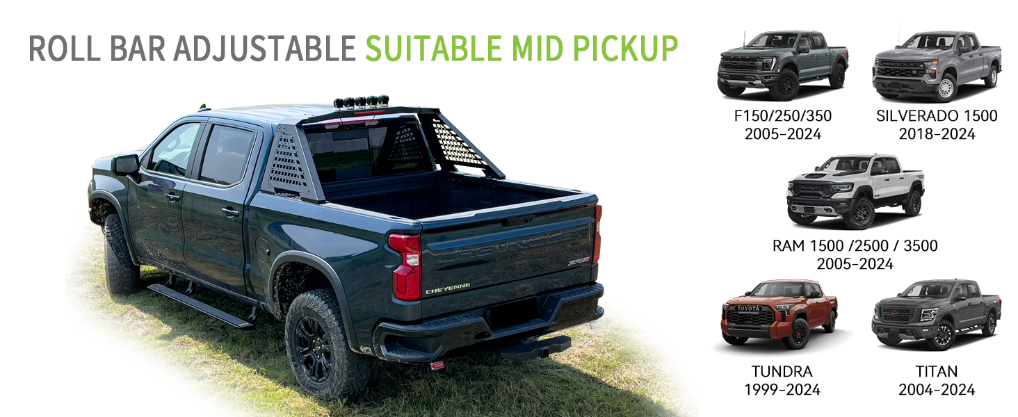 استكشف X Sport Roll Bar مع حاجز حماية جانبي قابل للفصل لسيارات Ford F150/250، وSilverado 1500، وRam 1500/2500، وSierra، وTundra، وتركيب بدون مثقاب قابل للتعديل | حامل خفيف (أسود كامل)