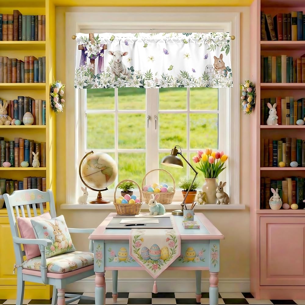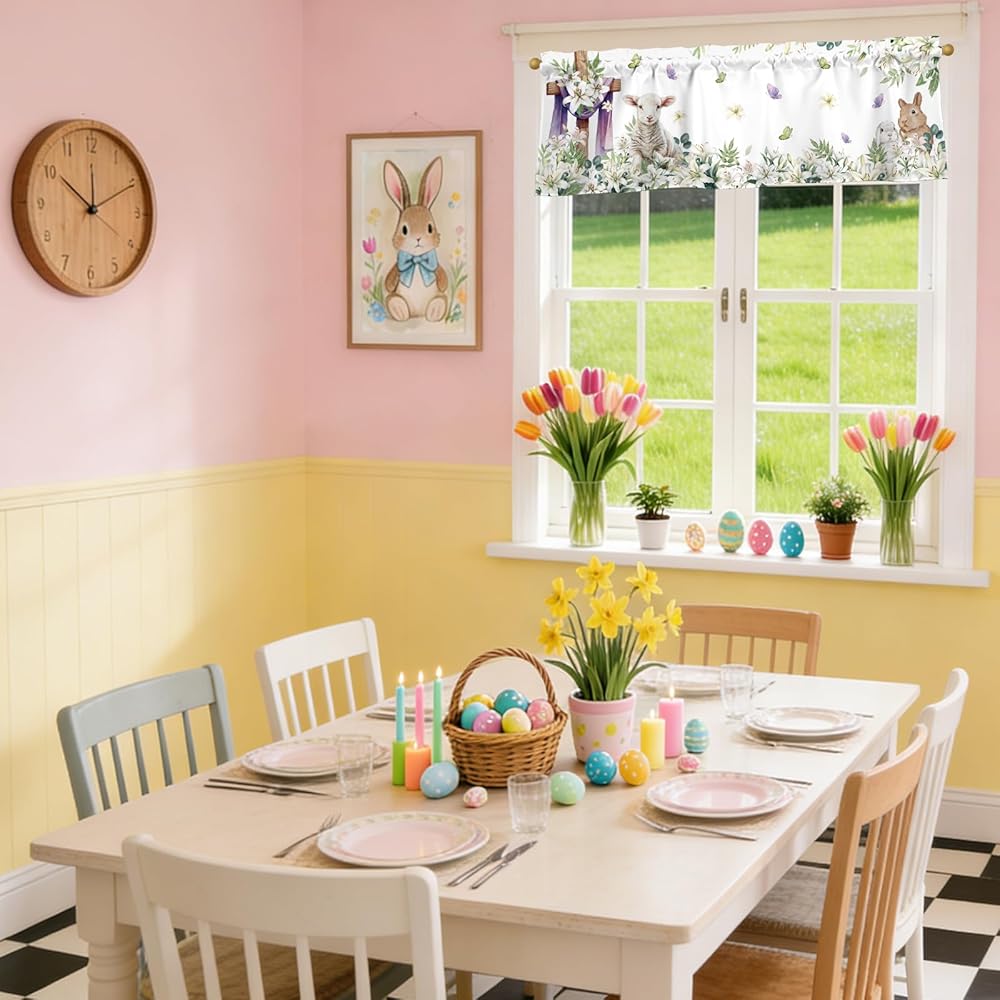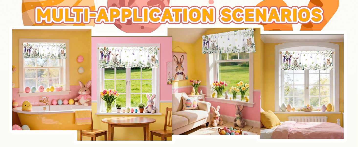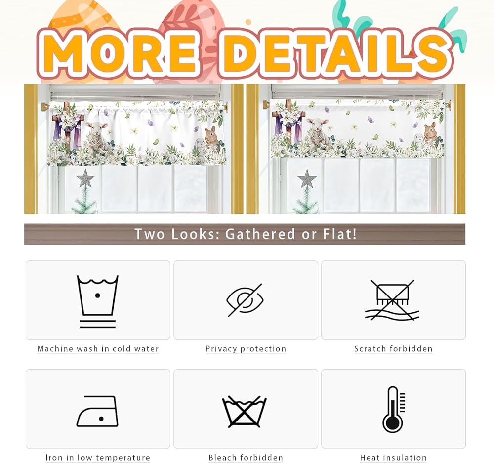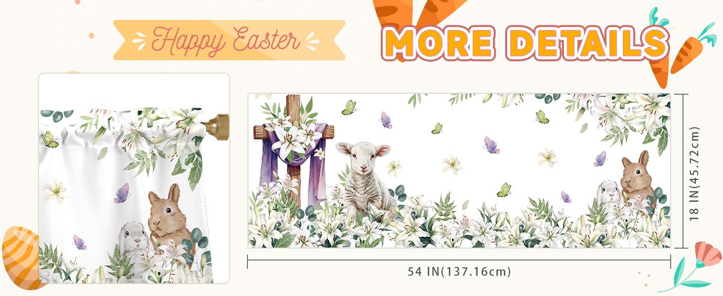 【محتويات العبوة】سوف تحصل على ستارة نافذة عيد الفصح مقاس 54 × 18 بوصة، مع جيب قضيب بعرض 2.56 بوصة/6.5 سم في الأعلى، مناسب لمعظم القضبان القياسية أو قضبان/أعمدة الستائر المزخرفة، وسهل التركيب. لا يتجعد.