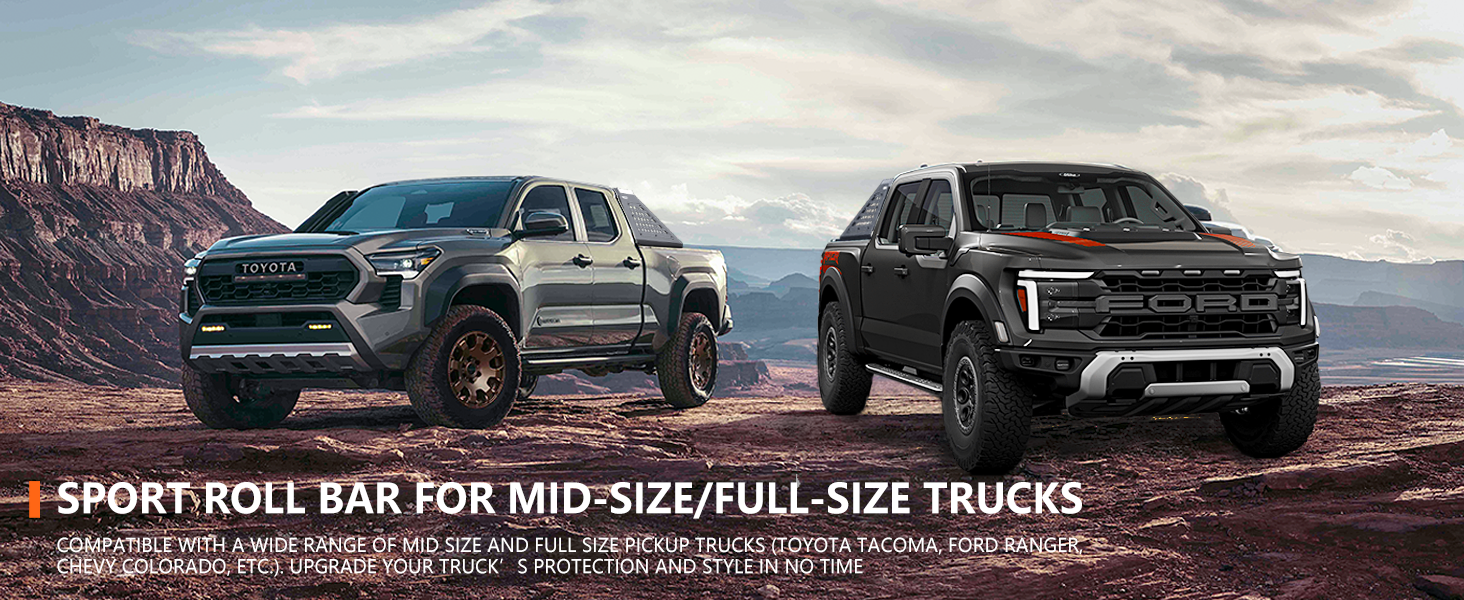 حامل شاحنة عالمي: مصمم كقضيب لف سرير شاحنة قابل للتعديل للالتقاط متوسط الحجم، 2005-2025 Toyota Tacoma/2020-2025 JEEP Gladiator/2019-2025 Ford Ranger /2015-2025 شيفروليه كولورادو/2015-2025 GMC Canyon /2015-2025 شاحنات فرونتير.