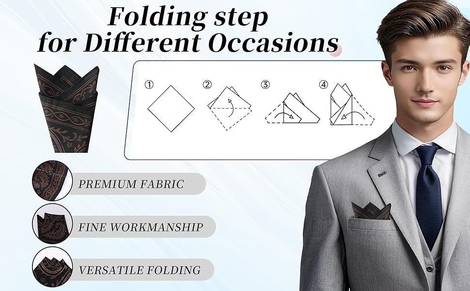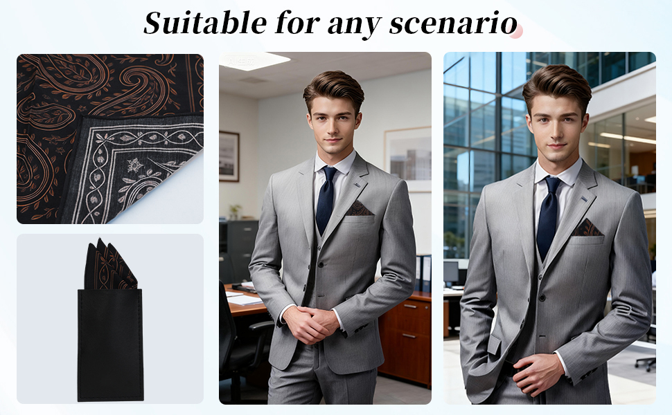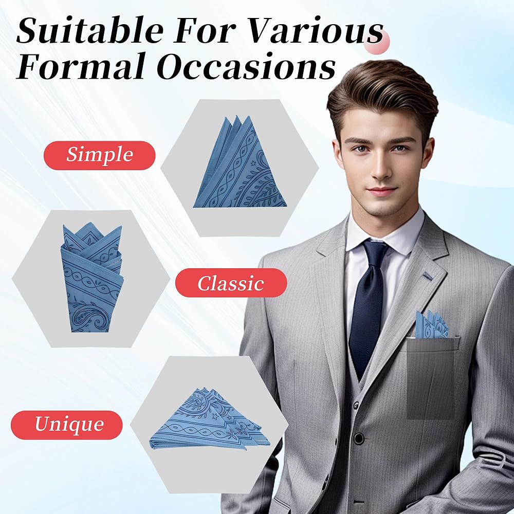 مربع جيب متعدد الأغراض: يمكن استخدام كل قطعة كمربع جيب أو منديل للرجال، مما يضيف الرقي إلى جيب سترتك أو يمكن استخدامه كملحق عملي لمسح العرق وآداب الطاولة والتنظيف وحفلات الزفاف.