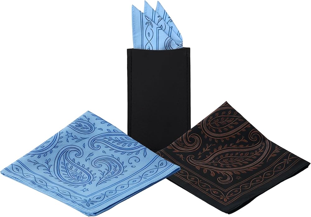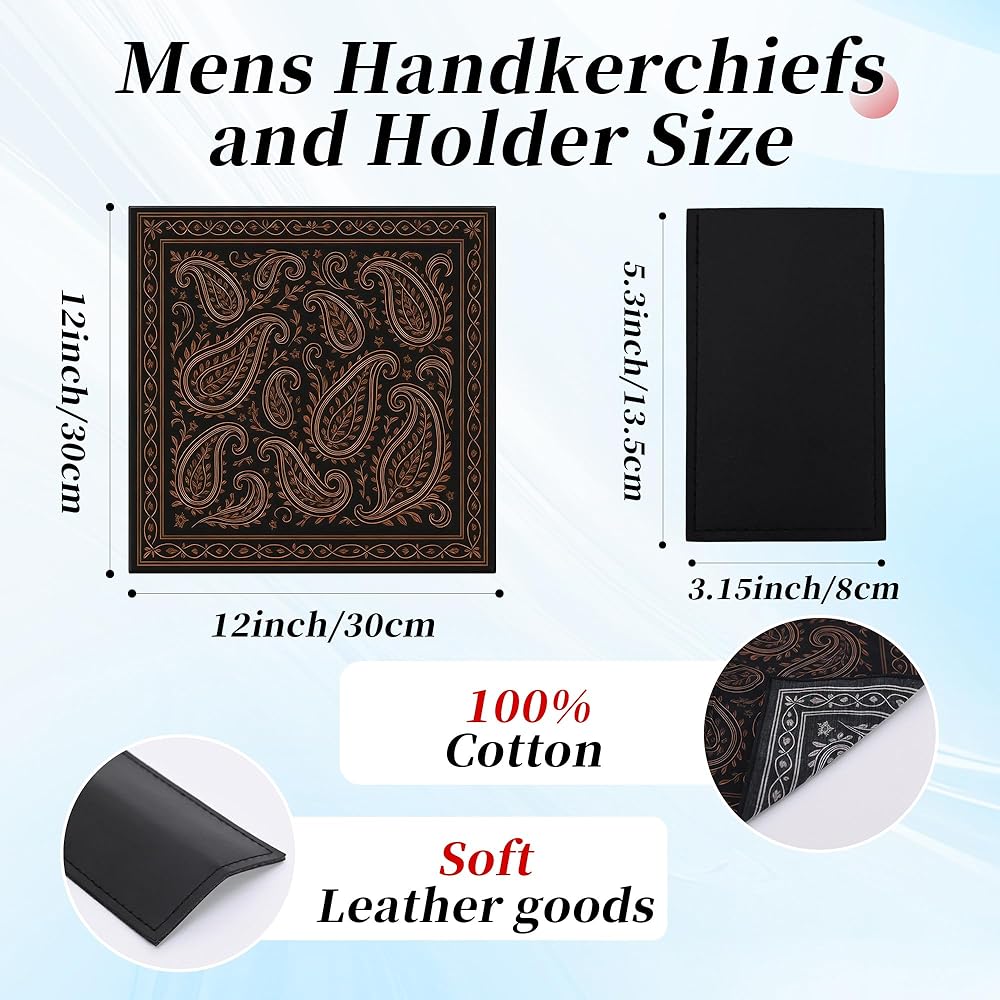 يأتي مع حامل مربع للجيب من جلد البولي يوريثان: قطعتان منديل (أسود + أزرق) معبأتان مع قطعة واحدة من حامل جيب مربع من جلد البولي يوريثان، حجم المنديل: 12 × 12 بوصة (30 × 30 سم)، حجم الحامل: 5.3 × 3.15 بوصة (13.5 × 8 سم).