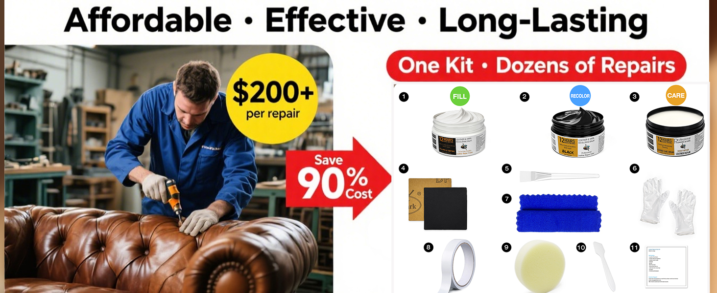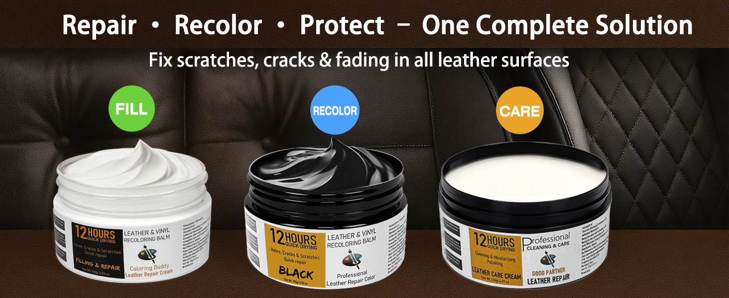 3-in-1 Complete Leather Repair Kit – Large Capacity: Our set includes 100g / 3.5oz Leather Repair Paste (for scratches & cracks) + 100g / 3.5oz Leather Filler Balm (for deep holes & tears) + 120g / 4.2oz Leather Care Cream. Unlike other kits with only a 20g / 0.7oz cream, ours provides filling, coloring, and care in one kit—covering multiple large projects.