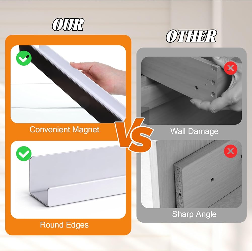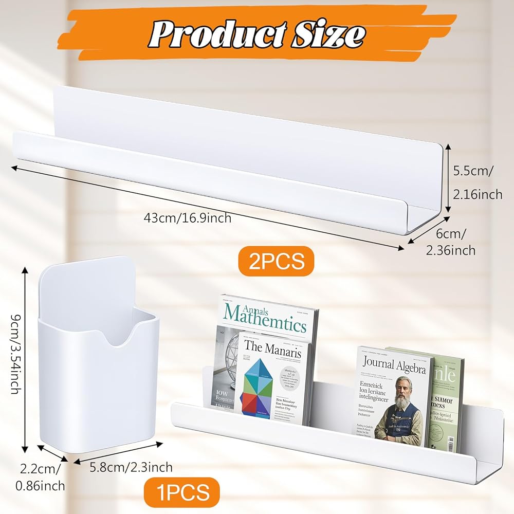 Easy Installation: No drilling required, the back of the magnetic bookshelf is equipped with magnets, simply peel off the adhesive film and attach to smooth surfaces. The magnetic backing ensures secure placement without sliding, allowing you to effortlessly attach it to any smooth metal surface, such as whiteboards or refrigerators. Reposition it freely and reuse it as needed.