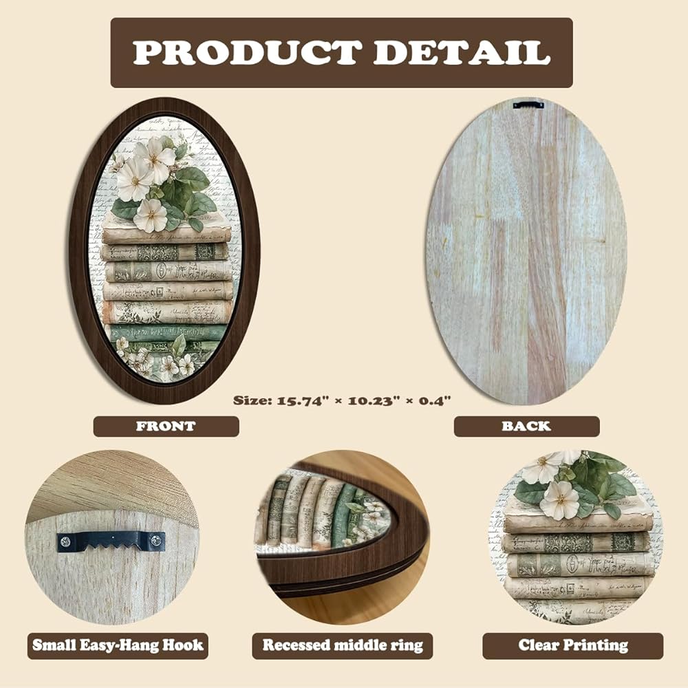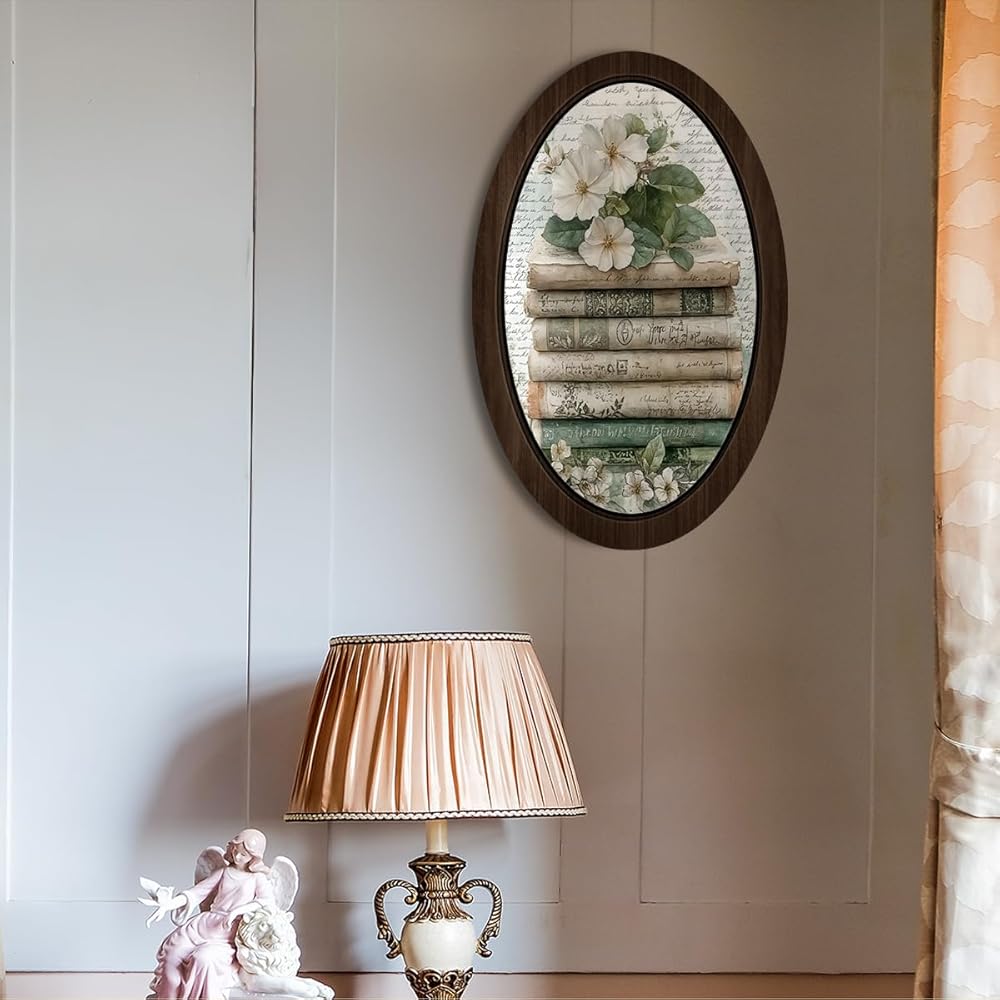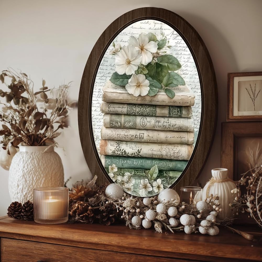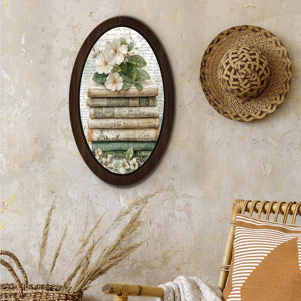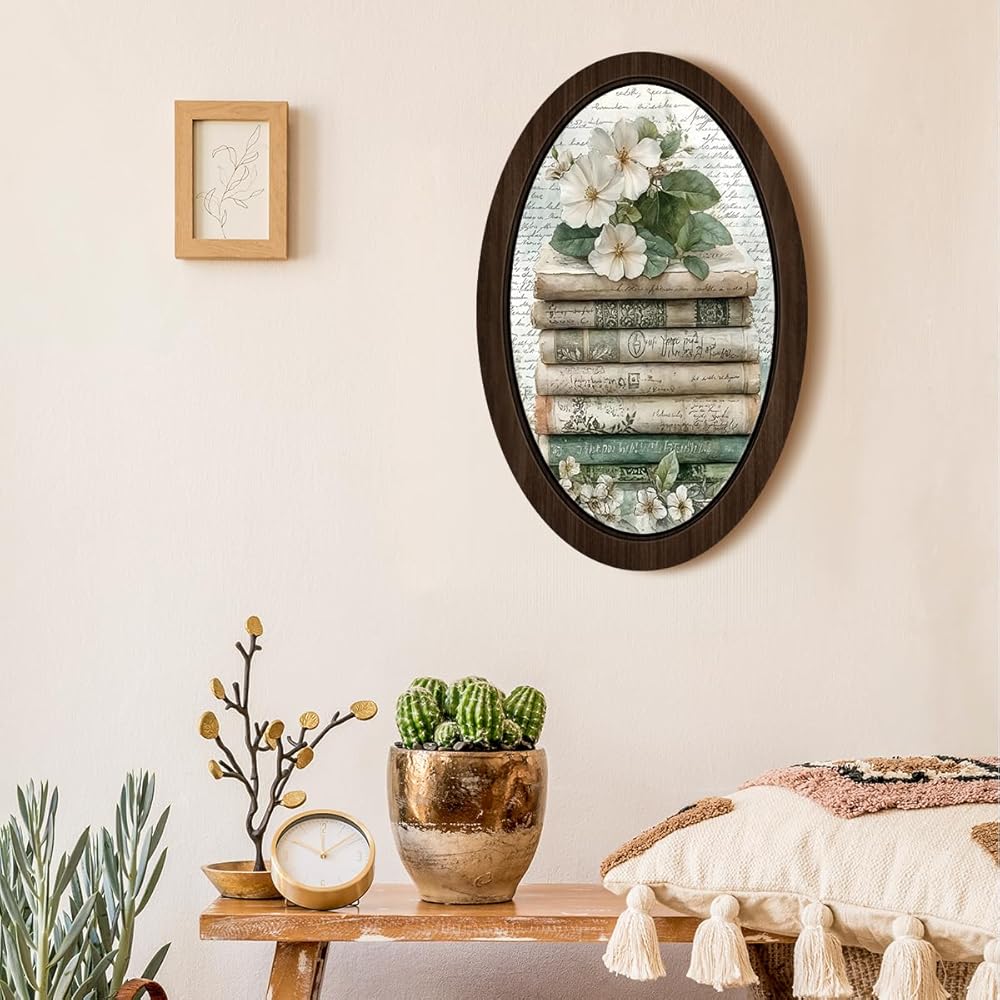BIWSHA خمر كتاب بيضاوي جدار الفن ديكور المكتبة، عشاق الكتب هدايا النادي، ريفي الأزهار Bookish مؤطرة خشبية جدار الفن شنقا ديكور غرفة لغرفة المعيشة مكتبة المنزل، 10.2x15.7 بوصة